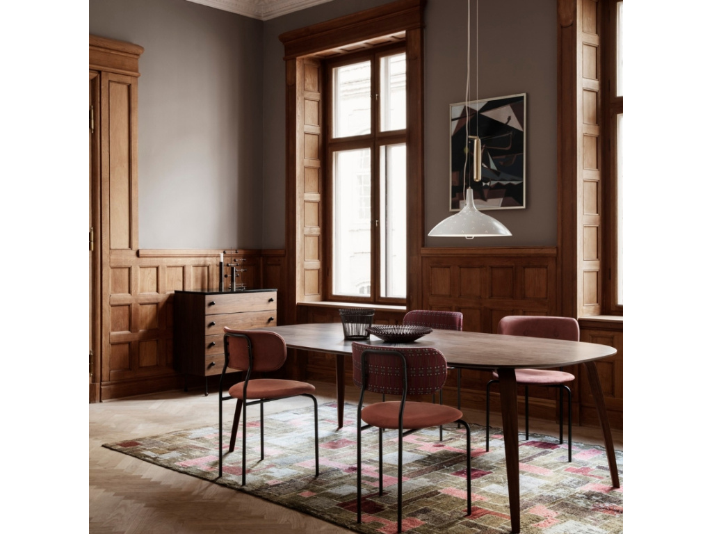 Jídelní stůl GUBI představuje elegantní a nadčasové řešení pro každý interiér. Dánské studio Komplot Design zkombinovalo skandinávský minimalismus s jemnými organickými liniemi, které vytvářejí útulnou a přívětivou atmosféru při každém stolování. Tento stůl je nejen estetickým, ale i funkčním prvkem – poskytuje dostatek místa pro pohodlné stolování a stane se centrem každé moderní jídelny. Je dostupný ve třech elegantních variantách povrchové úpravy – dub, americký ořech a výrazný černě mořený jasan. Každá z těchto verzí je navržena tak, aby ladila s různými styly interiérů, od skandinávských až po industriální. Pevná konstrukce z kvalitní dýhy a masivního dřeva zajišťuje stabilitu i dlouhou životnost.