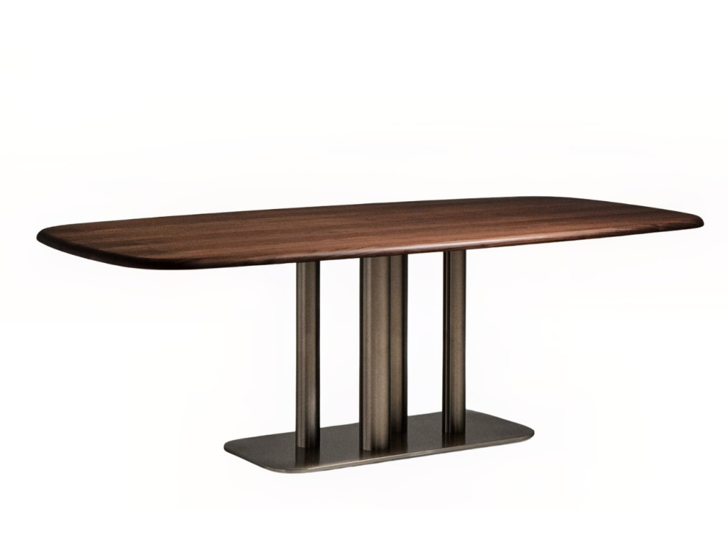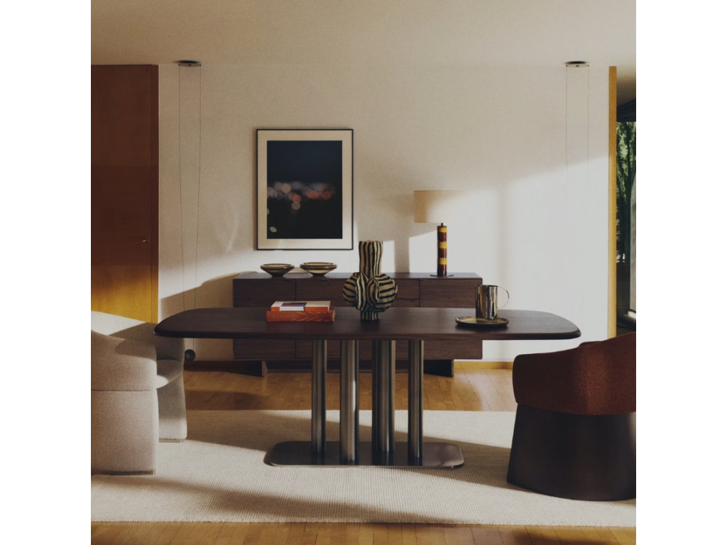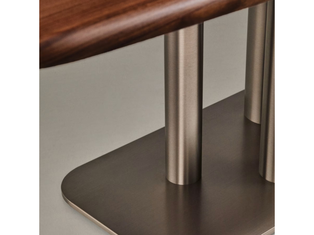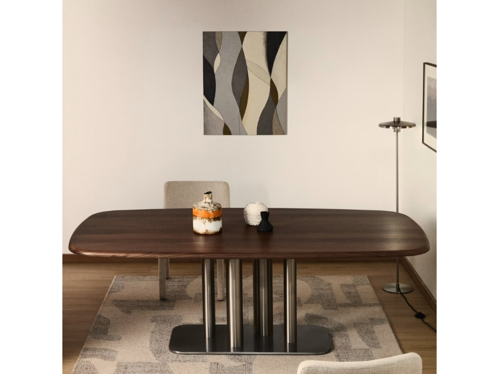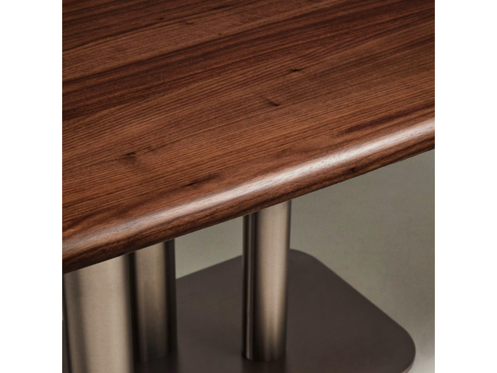 Stůl Melvar je skutečným designovým solitérem, který propojuje eleganci ořechové dýhy s výraznou podnoží z kartáčované nerezové oceli. Jeho čtvercová deska se zaoblenými rohy s tmavým, hřejivým odstínem vlašského ořechu přináší do interiéru útulnost a noblesu, zatímco kovová podnož s různými průměry vytváří dynamickou a moderní siluetu. Precizní zpracování, ochranný polyuretanový lak a FSC™ certifikované dřevo zajišťují dlouhou životnost i ohleduplnost k přírodě. Díky svým rozměrům nabídne pohodlné místo až pro čtyři hosty a stane se středem společných okamžiků, ať už jde o každodenní stolování, nebo slavnostní příležitosti. Melvar je důkazem, že funkčnost a krása mohou kráčet ruku v ruce a vytvořit kousek, který dodá vaší jídelně charakter i jedinečnou atmosféru. Vybírat navíc můžete z několika rozměrů – k dostání je i čtvercová varianta.