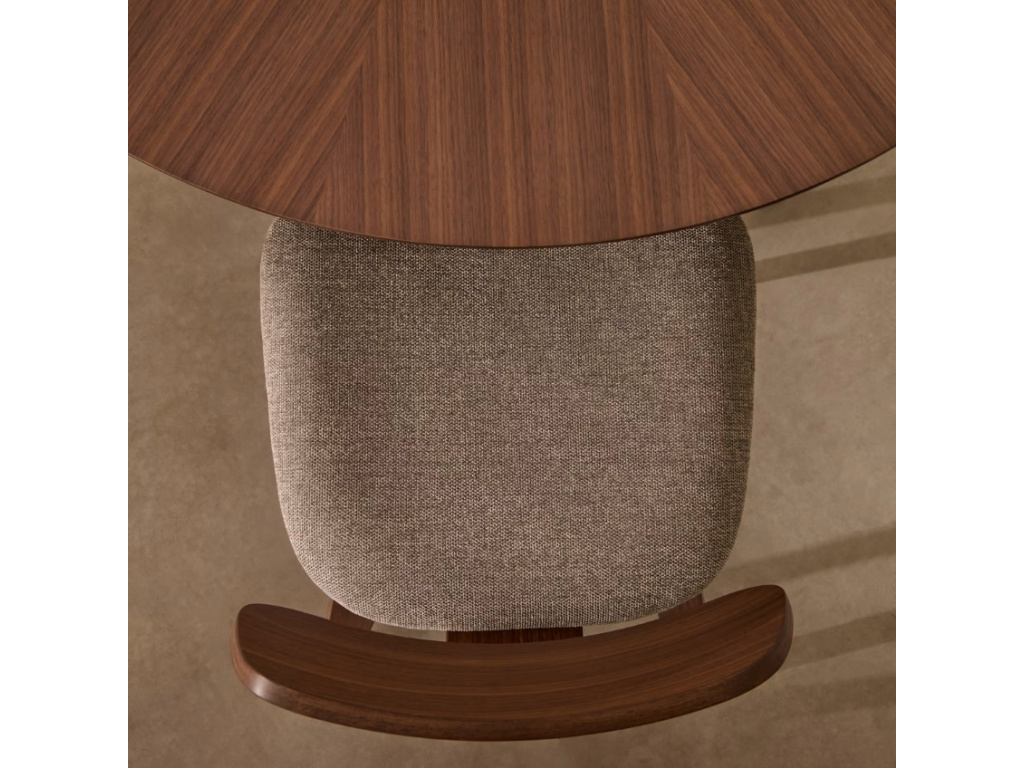 Jídelní stůl Naanim je dokonalým představitelem sofistikovaného designu. Kulatá deska stolu z ořechové dýhy vnáší do interiéru hřejivý a přirozený vzhled, zatímco originálně tvarovaná podnož z masivního kaučukovníku s ořechovým dekorem zajišťují stabilitu a nadčasovou eleganci. Díky nastavitelné podnoži se stůl snadno přizpůsobí i nerovným podlahám, takže vždy poskytuje pevnou a vyrovnanou plochu. Jeho kulatý tvar a chytré umístění podnože z něj činí ideální volbu pro menší prostory, kde nabízí maximální využití prostoru bez kompromisů na pohodlí či estetice. Stůl Naanim zaujme strukturou použité dýhy, která vytváří exkluzivní kresbu ve tvaru hvězdy – tento unikátní detail mu dodává osobitý charakter.