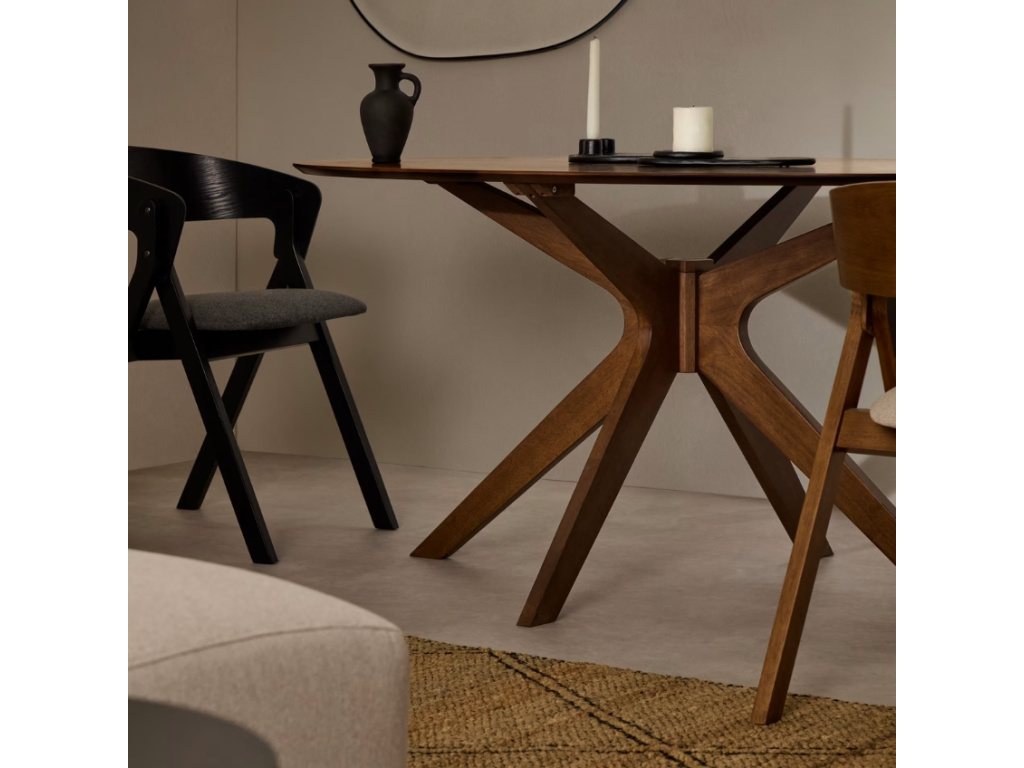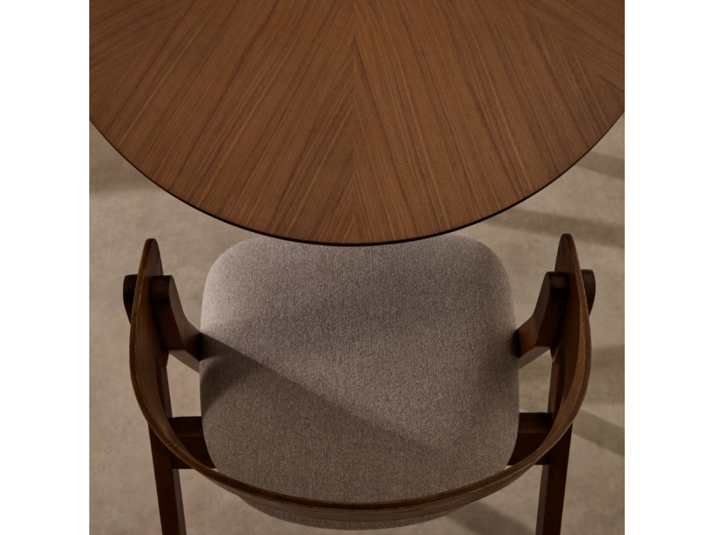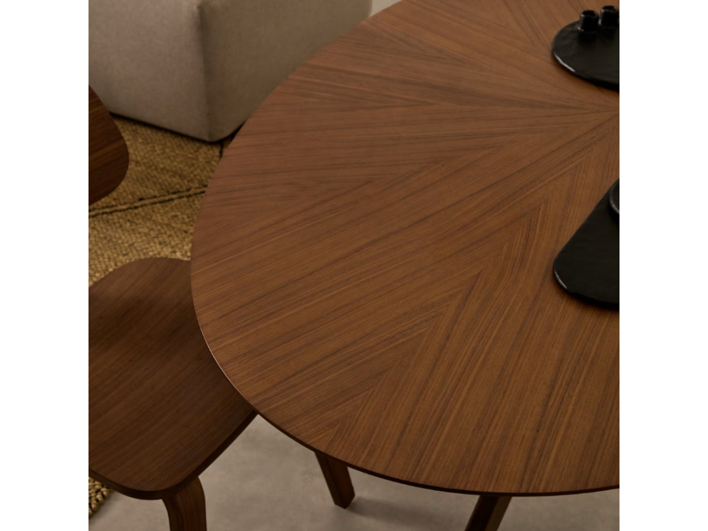 Jídelní stůl Naanim je dokonalým představitelem sofistikovaného designu. Oválná deska stolu z ořechové dýhy vnáší do interiéru hřejivý a přirozený vzhled, zatímco originálně tvarovaná podnož z masivního kaučukovníku s ořechovým dekorem zajišťují stabilitu a nadčasovou eleganci. Díky nastavitelné podnoži se stůl snadno přizpůsobí i nerovným podlahám, takže vždy poskytuje pevnou a vyrovnanou plochu. Jeho oválný tvar a chytré umístění podnože z něj činí ideální volbu pro menší nebo protáhlé prostory, kde nabízí maximální využití prostoru bez kompromisů na pohodlí či estetice. Stůl Naanim zaujme strukturou použité dýhy, která vytváří exkluzivní kresbu ve tvaru hvězdy – tento unikátní detail mu dodává osobitý charakter.