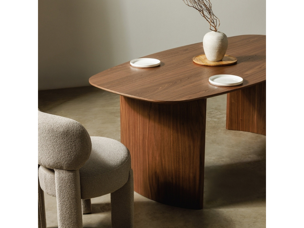 Jídelní stůl Maris je dokonalým spojením moderního stylu a nadčasové elegance. Je vyroben z kvalitní dýhy z ořechového dřeva, která mu dodává hřejivý vzhled a příjemnou strukturu. Díky tomu působí přirozeně a snadno zapadne do různých interiérů – od minimalistických po útulně přírodní. Výrazná, mírně zaoblená podnož tvoří originální siluetu, která odlišuje Maris od běžných stolů a dělá z něj skutečný designový kousek. Každý detail je promyšlený s důrazem na kvalitu a dlouhou životnost. Velkorysá stolová deska o rozměru 200 × 100 cm poskytuje dostatek prostoru pro rodinná jídla, večery s přáteli i slavnostní příležitosti. Maris je stůl, který zve ke společným chvílím – stane se přirozeným středem vaší jídelny a dodá jí eleganci, harmonii i osobitý styl.