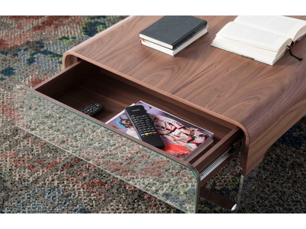 Konferenční stolek spojující přírodní krásu ořechové dýhy s moderním nádechem zrcadlových detailů si zamiluje každý milovník moderního designu. Jeho elegantní podnož z leštěné oceli dodá prostoru vzdušnost a lehkost. Prostorné boční zásuvky s tichým dovíráním ukrývají vše, co nemá být na očích. Lesklé plochy v kombinaci s přírodním charakterem kvalitního dřeva jej předurčují jako ideální doplněk do interiérů inspirovaných luxusním minimalismem.