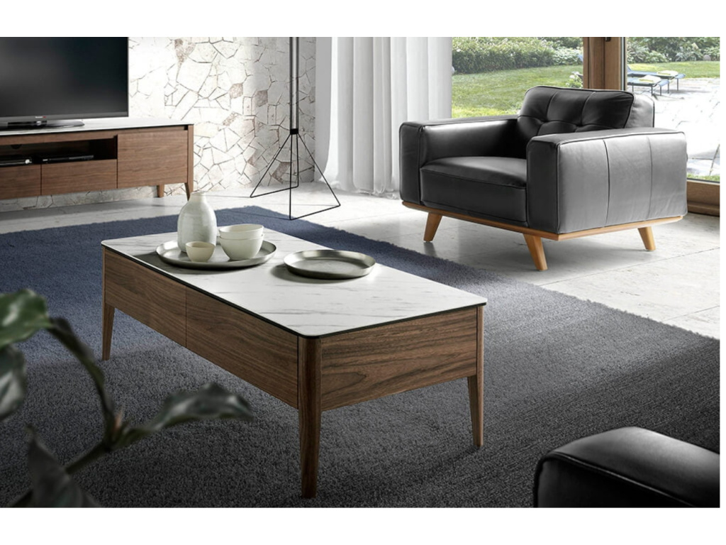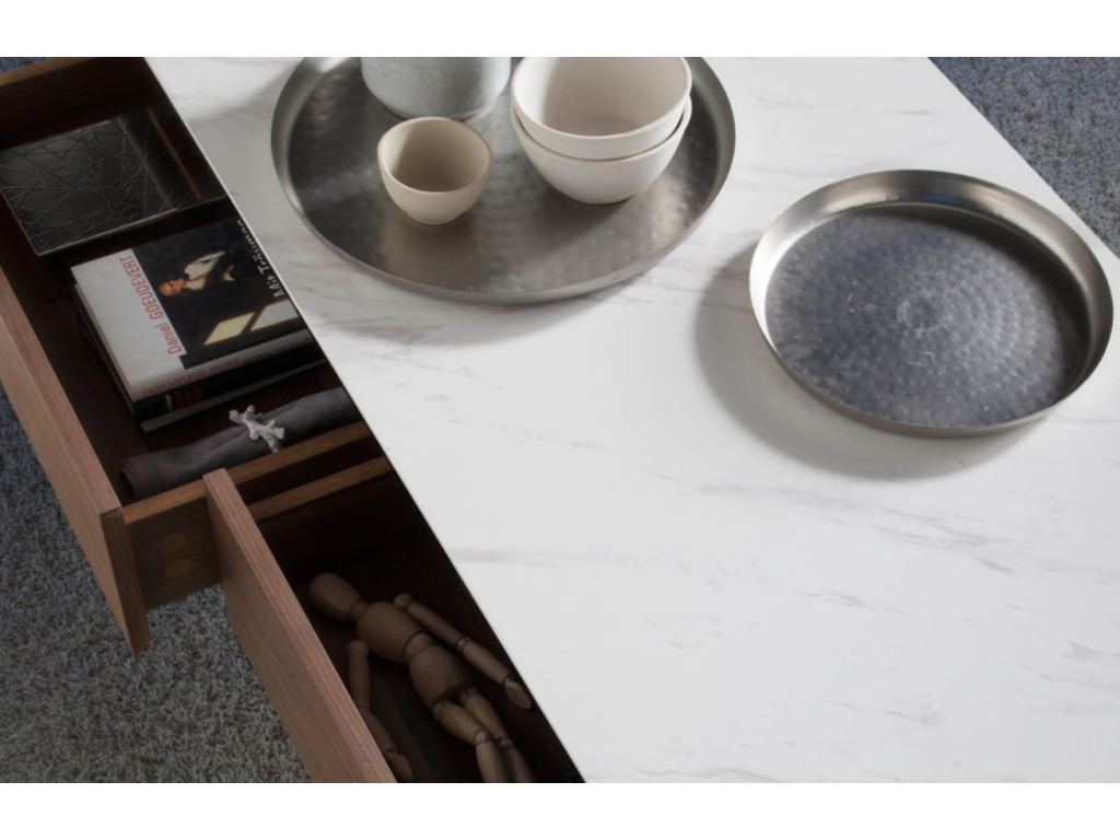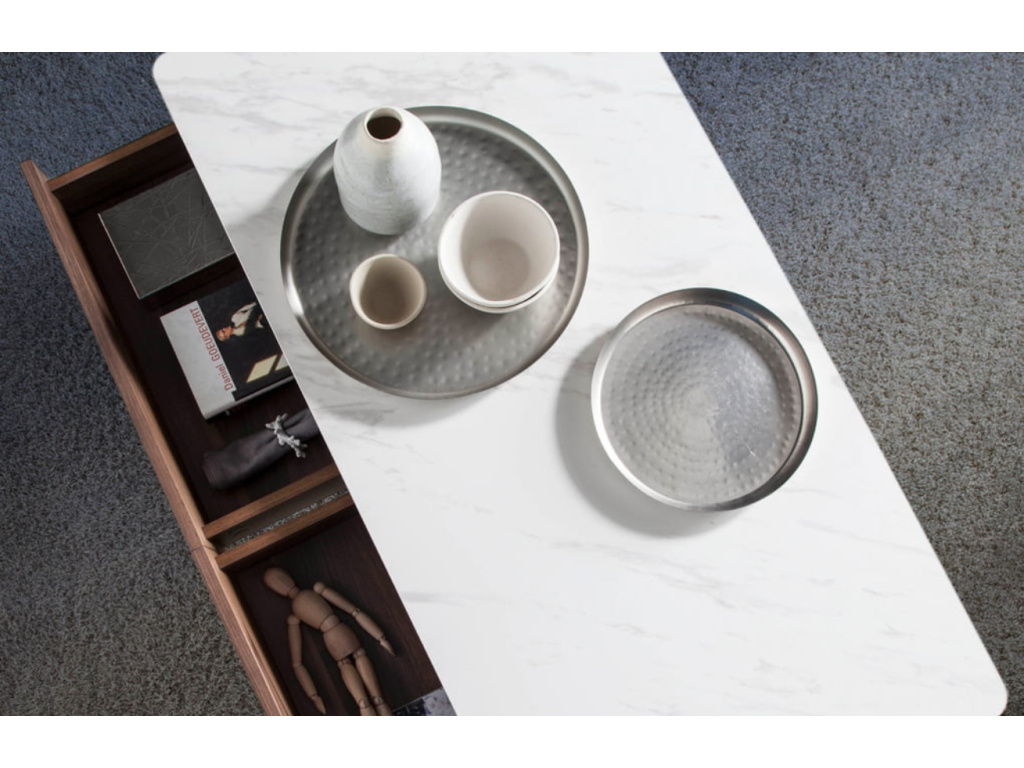 Konferenční stolek Angel Cerdá je stylový úložný prostor se dvěma praktickým zásuvkami pro uložení vašeho inventáře. Elegantní korpus z ořechové dýhy je doplněn o luxusní porcelánovou vrchní desku s dekorem mramoru, která celému kousku dodává šmrnc. Tento stolek je skvělou volbou pro ty, kteří si potrpí na moderní design a nestárnoucí klasiku. Pro naprostý soulad zkombinujte stolek s dalšími produkty Angel Cerdá ze stejné řady.