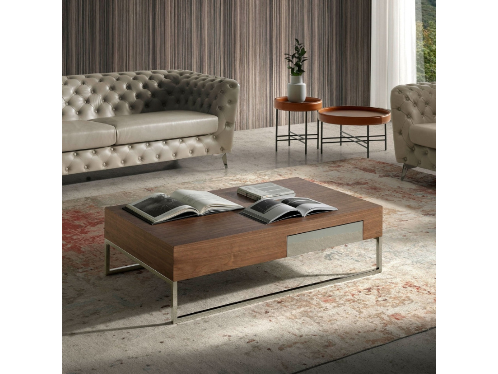 Objevte stylový konferenční stolek, který zaujme precizním řemeslným zpracováním a rafinovanými detaily. Masivní ořechová dýha v kombinaci s nerezovou podnoží vytváří nadčasový kontrast přírodního a průmyslového prvku. Prostorná zásuvka s dotykovým otevíráním se postará o dokonalý pořádek – ať už do ní uložíte časopisy, ovladače nebo jiné nezbytnosti. Jemné linie a hladká povrchová úprava dodají vašeho interiéru útulný, ale zároveň moderní ráz. Perfektní volba do interiérů inspirovaných newyorskými lofty.