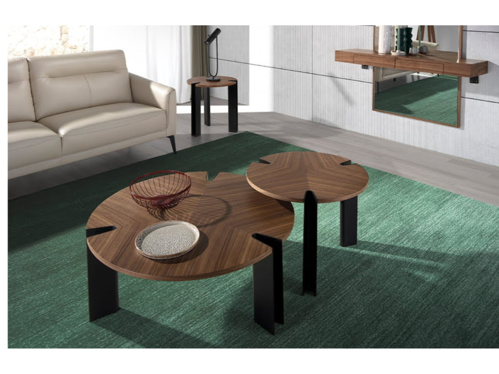 Stylový konferenční stolek od značky Angel Cerdá bude skvělým doplňkem moderního obývacího pokoje. Desku tvoří ořechová dýha rozdělená do několika částí směřujících ke středu a tvoří tak jedinečný vzor v kresbě dřeva. Zajímavým designovým detailem je masivní černá ocelová podnož zapuštěná do desky stolku, ve které tak vznikají volné prostory ve tvaru písmene V. Vychutnejte si chvilku klidu s šálkem kávy u tohoto originálního designového kousku.