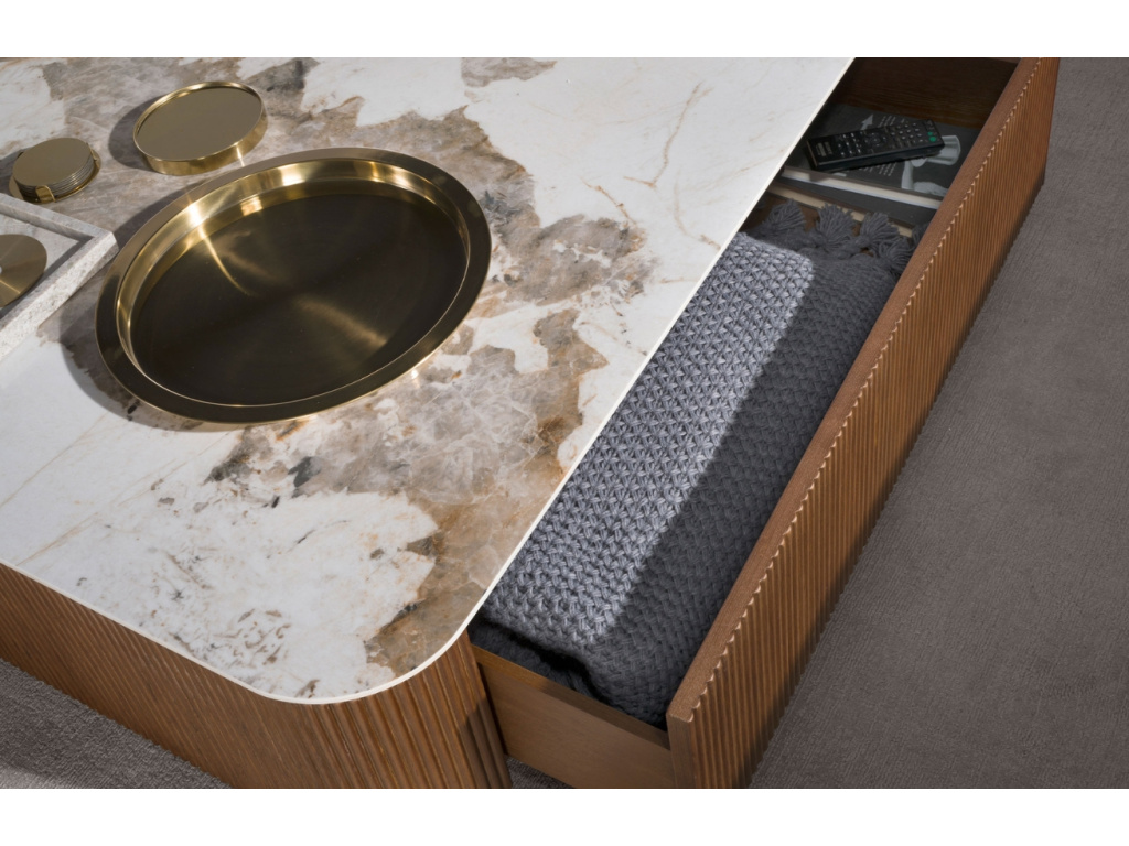 Konferenční stolek od Angel Cerdá s luxusní porcelánovou deskou s mramorovým dekorem v zemitých odstínech vám pomůže doladit váš obývací pokoj. Deska se svými rozměry nabízí nezvykle velkou odkládací plochu. Ořechová podnož stolku je tvořena konstrukcí s lamelovým dekorem, která v sobě skrývá prostornou zásuvku do níž můžete uložit vše potřebné. Pohodlně se do ní vejde klidně i deka připravená k tomu, abyste se do ní mohli za chladných večerů zachumlat.