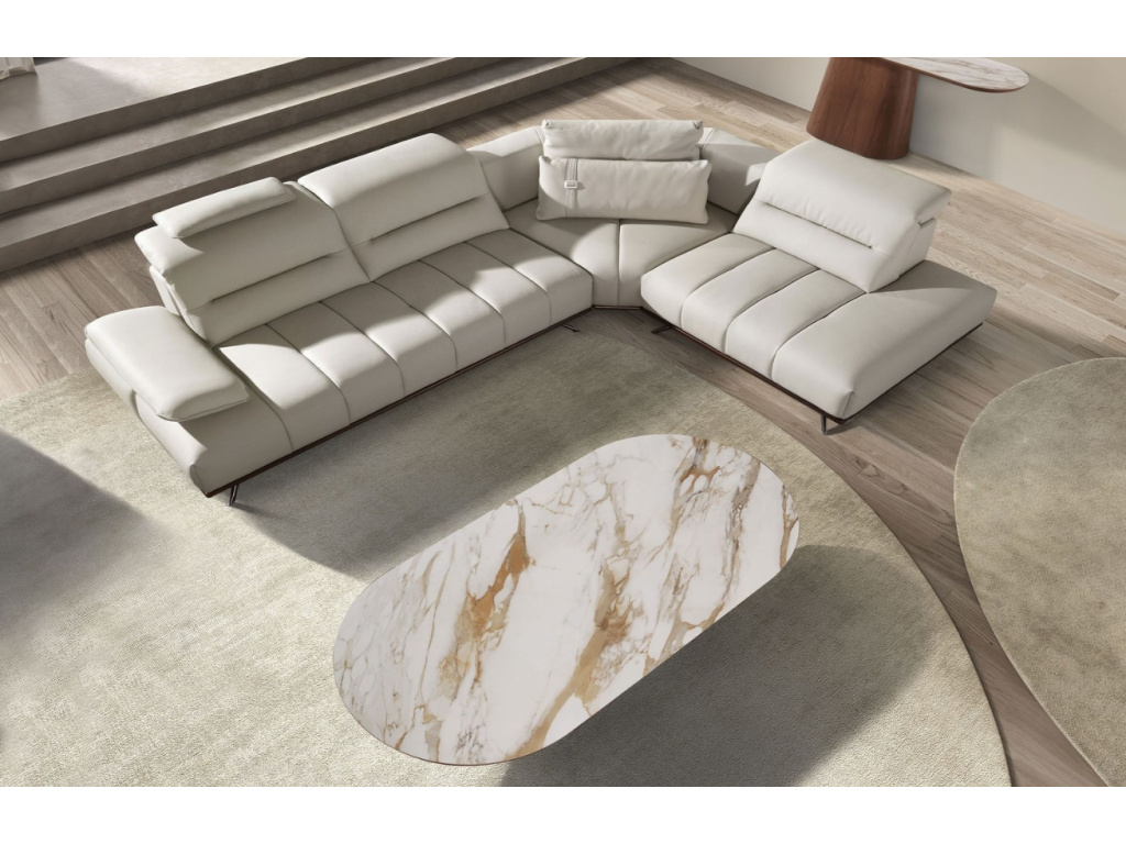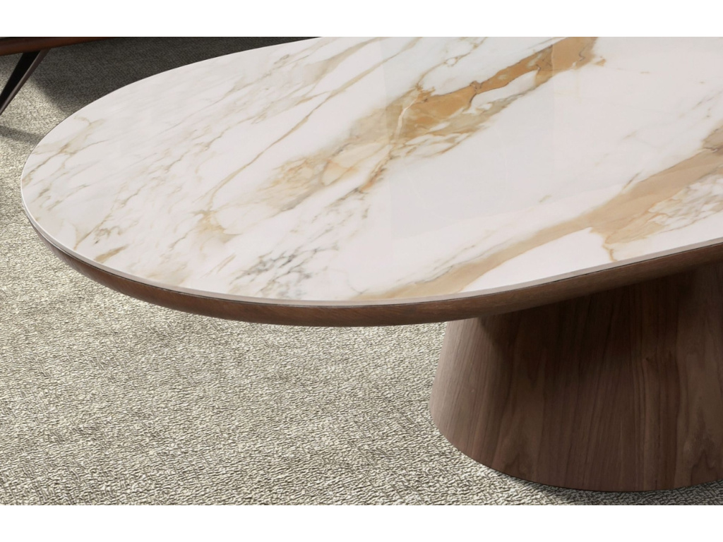 Objevte krásu kontrastů s konferenčním stolkem Angel Cerdá – oválným kouskem, který v sobě spojuje přirozené teplo ořechové dýhy a luxusní vzhled porcelánové desky v mramorovém dekoru. Jeho harmonická silueta a nadčasové materiály z něj dělají nejen praktický doplněk, ale i výrazný designový solitér. Porcelánová horní deska je odolná vůči poškrábání i vysokým teplotám, a díky tomu je nejen krásná, ale i funkční. Podnož s ořechovou povrchovou úpravou působí subtilně, přesto poskytuje stabilní základ. Tento stolek se stane elegantním detailem, který dotvoří váš interiér s lehkostí a charakterem. Sladit ho navíc můžete také s odkládacím, toaletním a jídelním stolem!