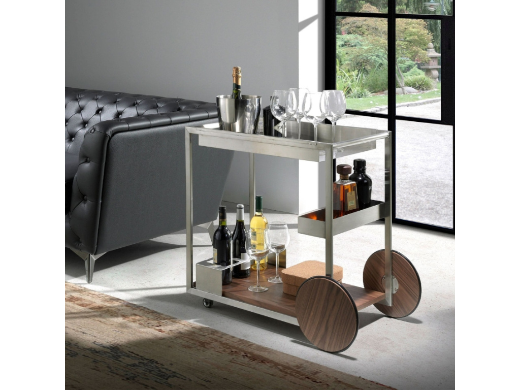 Tento elegantní servírovací vozík se stane nepřehlédnutelným doplňkem vaší domácnosti. Díky kombinaci leštěné nerezové oceli, ořechového dřeva a praktických funkcí jako jsou držák na láhve a dva prostorné tácy přinese do vašeho obývacího pokoje či jídelny nádech luxusu. Bude ideální pro servírování nápojů při rodinných oslavách nebo pro stylové vystavení vašich oblíbených lahví vína. Jeho design harmonicky zapadne do interiérů inspirovaných skandinávským nebo minimalistickým stylem. Praktický pojezd zajistí snadný pohyb díky kvalitním kolečkům, které jdou díky ořechové dýze originálním detailem vozíku.