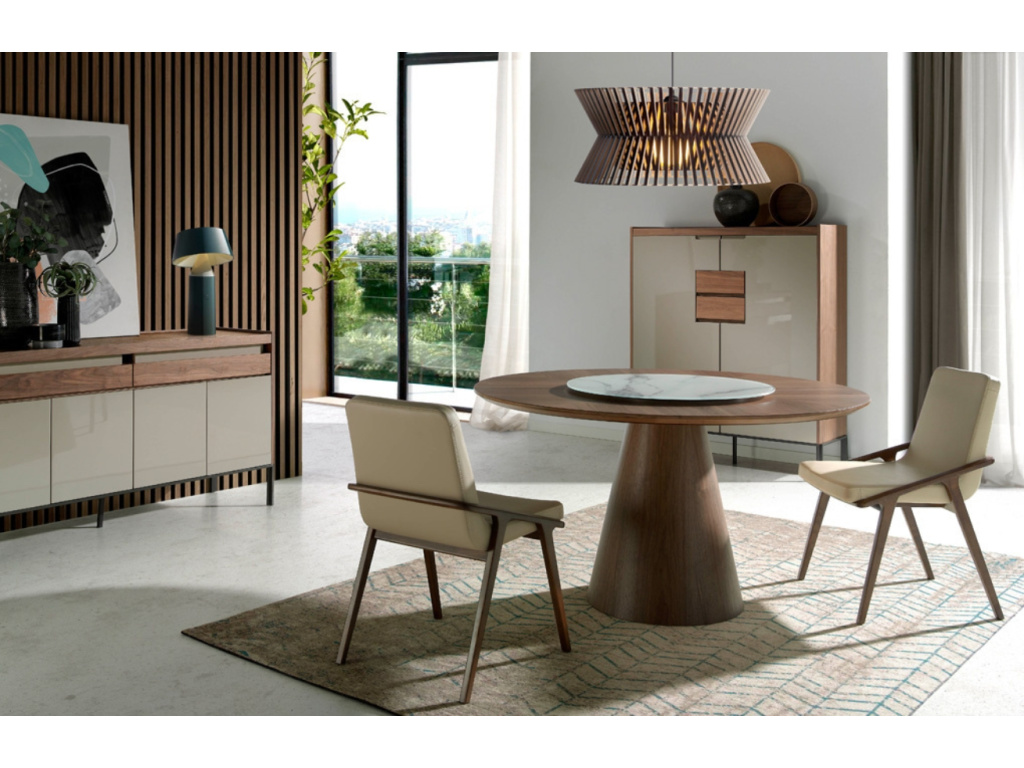 Minimalistický jídelní stůl od Angel Cerdá si zamilujete pro jeho čistý design a na první pohled pevnou masivní konstrukci z ořechové dýhy. Je obohacen o kulatou porcelánovou desku s dekorem mramoru, na kterou můžete servírovat různé pokrmy nebo nádobí. Díky její otočné funkci se každý strávník u stolu pohodlně dostane ke všemu potřebnému. Tento jedinečný a praktický kousek se stane ozdobou každé moderní jídelny.