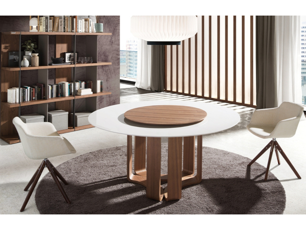 Originální jídelní stůl od Angel Cerdá na první pohled zaujme svou atypicky tvarovanou podnoží z ořechové dýhy. Svým rozměrem umožňuje pohodlné stolování až šesti strávníkům. Porcelánová deska s dekorem mramoru je obohacena o kulatou odnímatelnou ořechovou plochu, na kterou můžete servírovat různé pokrmy nebo nádobí. Díky její otočné funkci se každý u stolu pohodlně dostane ke všemu potřebnému. Čistý design a praktická funkce stolu obohatí každou moderní jídelnu.