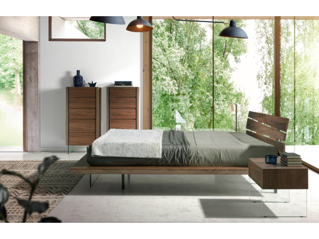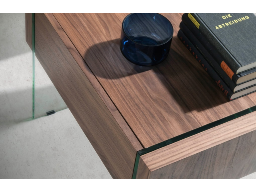 Designový noční stolek Angel Cerdá spojuje ořechovou dýhu a podnož z tvrzeného skla, které společně vytvářejí jedinečný kontrast. Sklo vzbuzuje pocit, jako by se vrchní část vznášela a stolku tak dodává dojem vzdušnosti. Jeho praktická zásuvka se postará o uspořádání vašich nezbytných drobností v ložnici. Vytvořte svěží a provzdušněný prostor s tímto stylovým kusem nábytku. Pro naprosté vyladění interiéru zkombinujte noční stolek s dalším nábytkem ze stejné řady.