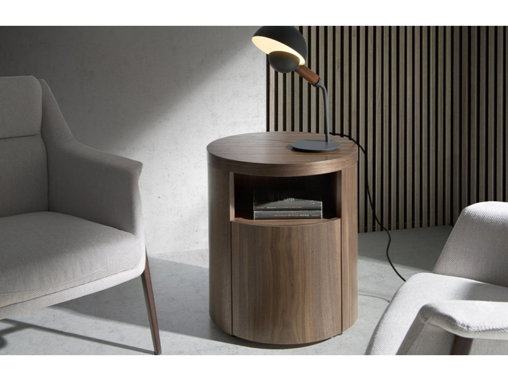 Kulatý noční stolek značky Angel Cerdá perfektně doladí vaší ložnici. Díky němu budete mít během usínání a po probuzení všechny nezbytnosti po ruce, a navíc prakticky uložené. O to se postará otevřená police a důmyslně skrytá zásuvka. Elegantní vzhled zaručuje kvalitní zpracování z ořechové dýhy, která do pokoje přinese hřejivou útulnou atmosféru.