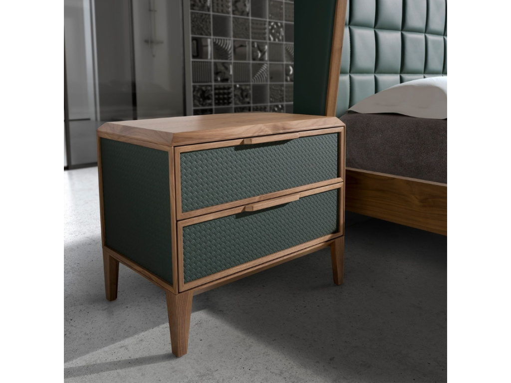 Tento noční stolek kombinuje eleganci přírodního dřeva s jemným retro nádechem. Ořechová dýha v kontrastu s tmavě zelenými čely zásuvek působí stylově a neotřele. Geometrické zpracování PVC potahu dodává stolku originální texturu. Dvě prostorné zásuvky s měkkým dovíráním vám umožní uložit vše potřebné, od oblíbené knihy po drobné osobní předměty. Díky minimalistické podnoži působí stolek subtilně, ale zároveň nabízí dostatek stability. Skvělý doplněk do ložnice inspirované skandinávským nebo retro stylem.