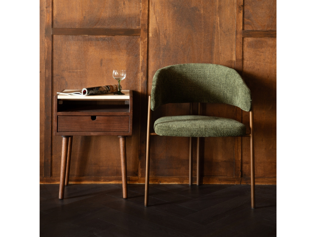Noční stolek ARDA značky DUTCHBONE si získá vaši pozornost především pro jedinečnou kamennou deskou z travertinu. Ta dodá interiéru nádech luxusu a elegance. Travertin je druh vápence s živoucí texturou, která dodává stolku přirozenou krásu a časem i jedinečnou patinu. Kamenná deska spolu s konstrukcí z dubové dýhy v ořechovém provedení tvoří perfektní celek. Díky zásuvce a otevřené polici poskytne dostatek úložného prostoru pro váš inventář, který chcete i nechcete mít na očích. ARDA zazáří v moderním i vintage interiéru a nejlépe ve společnosti dalšího nábytku z řady ARDA – zkompletujete celý set?