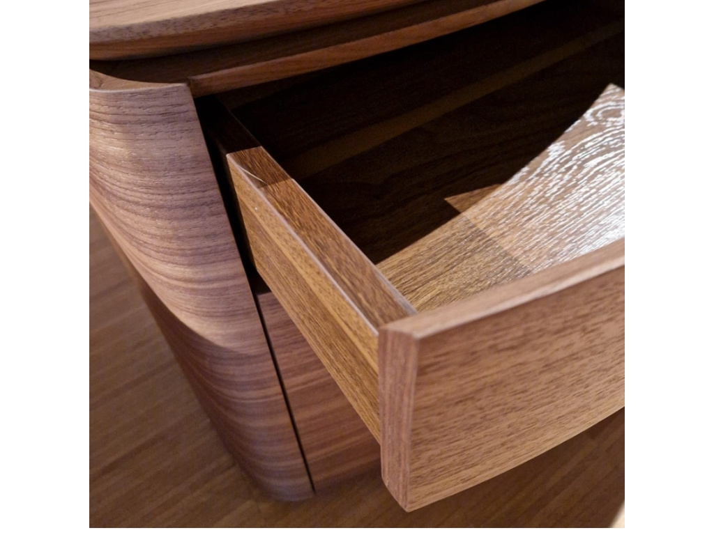 Noční stolek je nezbytností každé ložnice. Stolek Calano se pyšní dvěma prostornými zásuvkami, kam si pohodlně uložíte mnoho každodenních nezbytností. Atraktivní zaoblený tvar stolku v kombinaci s ořechovým dekorem s výraznou kresbou skvěle zapadne do ložnic laděných do přírodních materiálů. Na noční stolek si každý večer odložte rozečtenou knihu nebo brýle a užijte si poklidný spánek.