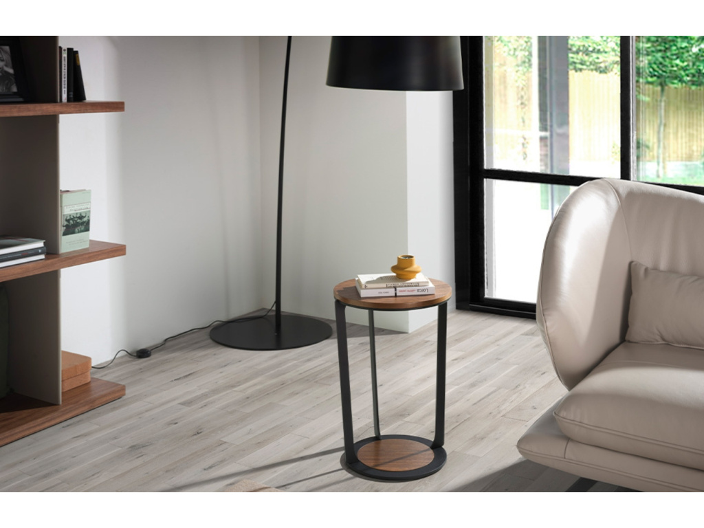 Odkládací stolek, kterým doladíte každý moderní interiér kombinující kovové a přírodní prvky, přináší španělská značka Angel Cerdá. Černá ocelová podnož s industriálním nádechem propojuje originálním způsobem desku a podstavu z ořechové dýhy. Stolek dobře poslouží jako odkládací plocha a slušet mu to bude i jako podstavci pro umělecké dílo – například sochu.