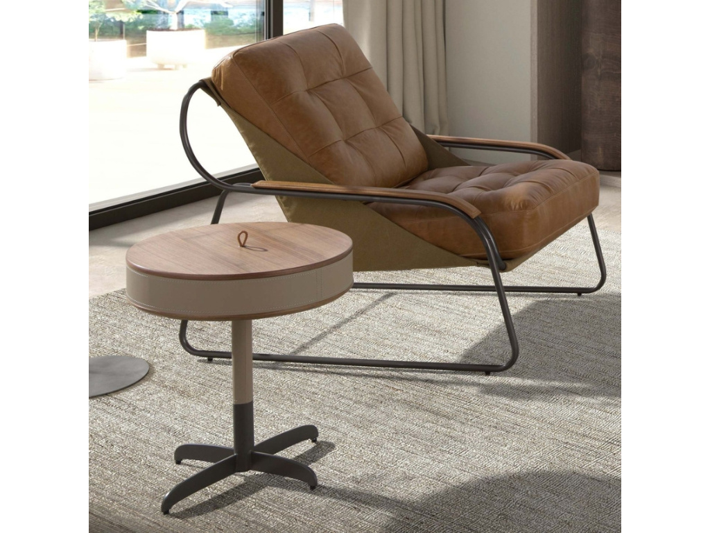 Elegantní, s nádechem luxusu – kulatý odkládací stolek od Angel Cerdá v sobě spojuje vše, co od moderního doplňku čekáte. Kombinace ořechové dýhy, grafitově šedé kovové podnože a béžového čalounění z pravé kůže působí promyšleně a nadčasově. Každý detail má své místo. Skvěle se hodí vedle pohovky, křesla nebo postele – ať už na šálek kávy, oblíbenou knihu nebo jen tak pro radost. Pod jeho deskou navíc najdete ukryté čtyři přihrádky, které můžete využít na nejrůznější drobnosti – třeba karty, ovladače, brýle nebo oblíbené dobroty. Praktický, stylový a s osobitým šarmem, který si snadno získá své místo ve vašem interiéru!