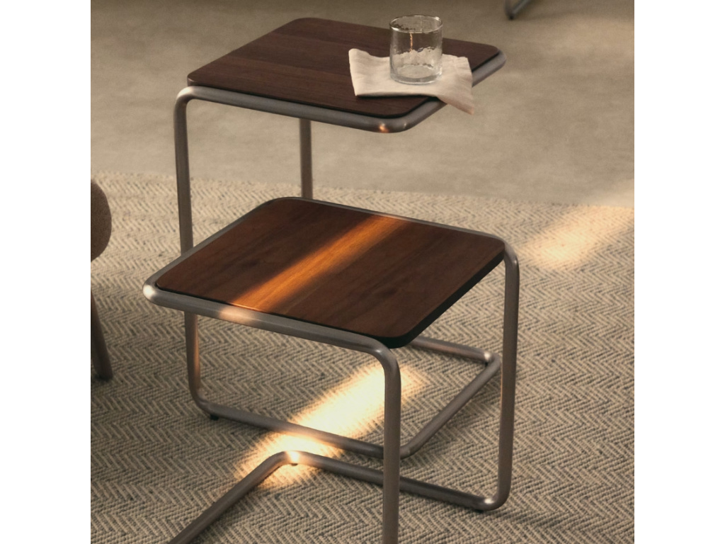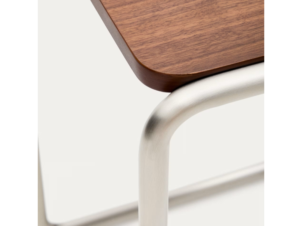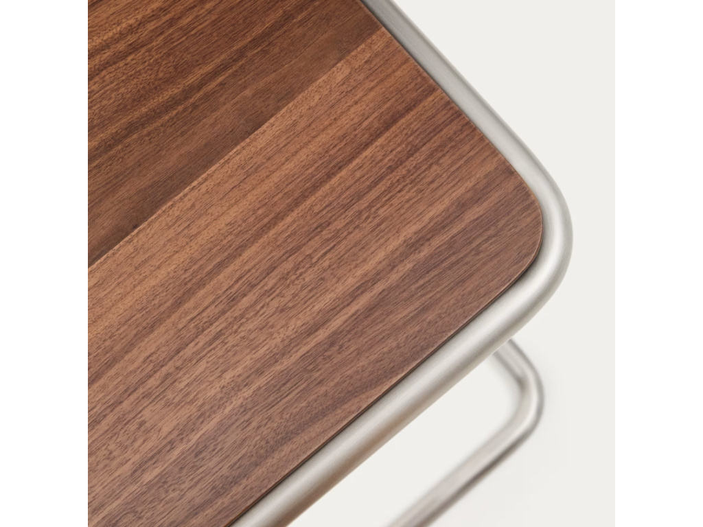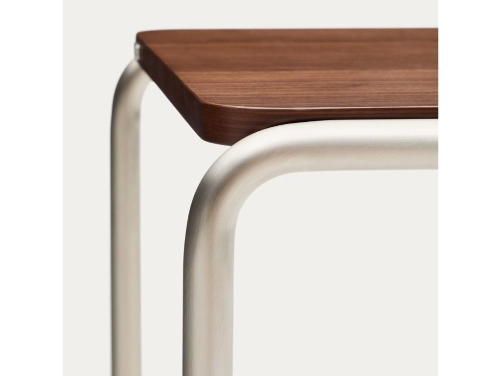 Stolek Tarsel přináší reinterpretaci elegance poloviny 20. století prostřednictvím současného designového jazyka, který dokonale vyvažuje funkčnost a vizuální sofistikovanost. Jeho vrchní deska z ořechové dýhy o tloušťce 0,6 mm s tmavým mořením vytváří harmonický kontrast s trubkovou konstrukcí z nerezové oceli s kartáčovanou úpravou, která účinně redukuje viditelnost otisků prstů. Použité dřevo nese 100% certifikaci FSC™, což zaručuje odpovědné lesní hospodaření, sledovatelnost původu a respekt k životnímu prostředí. Tarsel lze kombinovat se stejnojmennou lavicí a vytvořit tak praktické a designově sladěné duo. Díky nastavitelným prvkům na podnoži se snadno přizpůsobí i nerovným podlahám, čímž zajišťuje stabilitu a komfort v každém prostoru – ideální volba pro stylové a flexibilní bydlení.