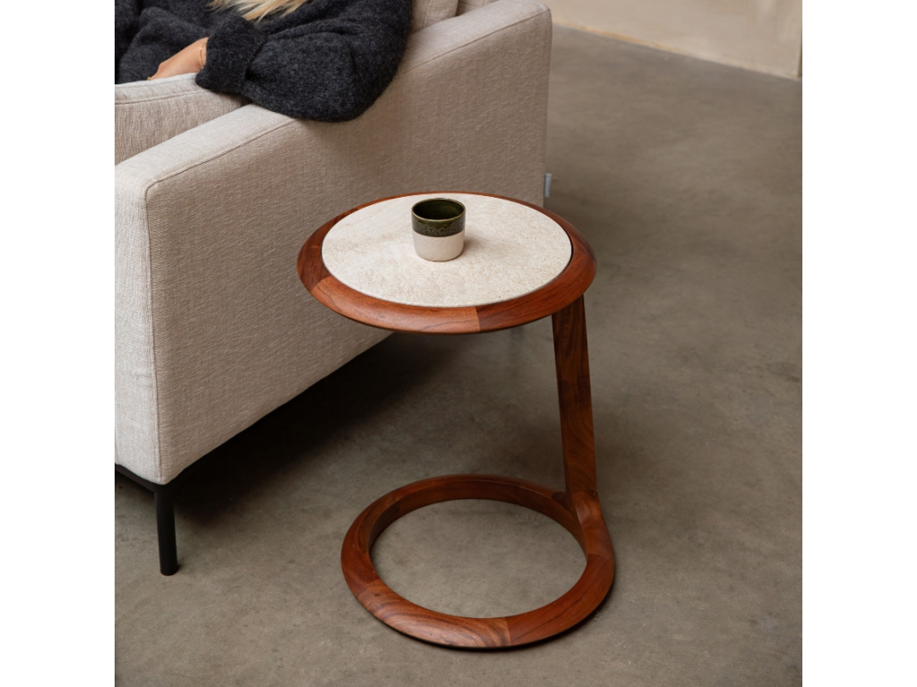 DOPPIO znamená v italštině „dvojitý“ a právě tento koncept se prolíná celým designem tohoto výjimečného odkládacího stolku. Od dvojitých kruhů v jeho konstrukci až po kombinaci dvou materiálů, které se vzájemně elegantně doplňují. I jeho funkce je dvojnásobná – stolek nejen přidá interiéru na stylu, ale zároveň je praktický, protože ho lze snadno přisunout přes sedák pohovky. Deska je vyrobena z travertinu, což je druh vápence s živoucí texturou, která dodává stolku přirozenou krásu a časem i jedinečnou patinu. Kamenná deska spolu s podnoží z akátového dřeva v ořechovém provedení tvoří perfektní celek. DOPPIO vnese do každé místnosti svěžest a originalitu a neunikne pozornosti žádné vaší návštěvy.