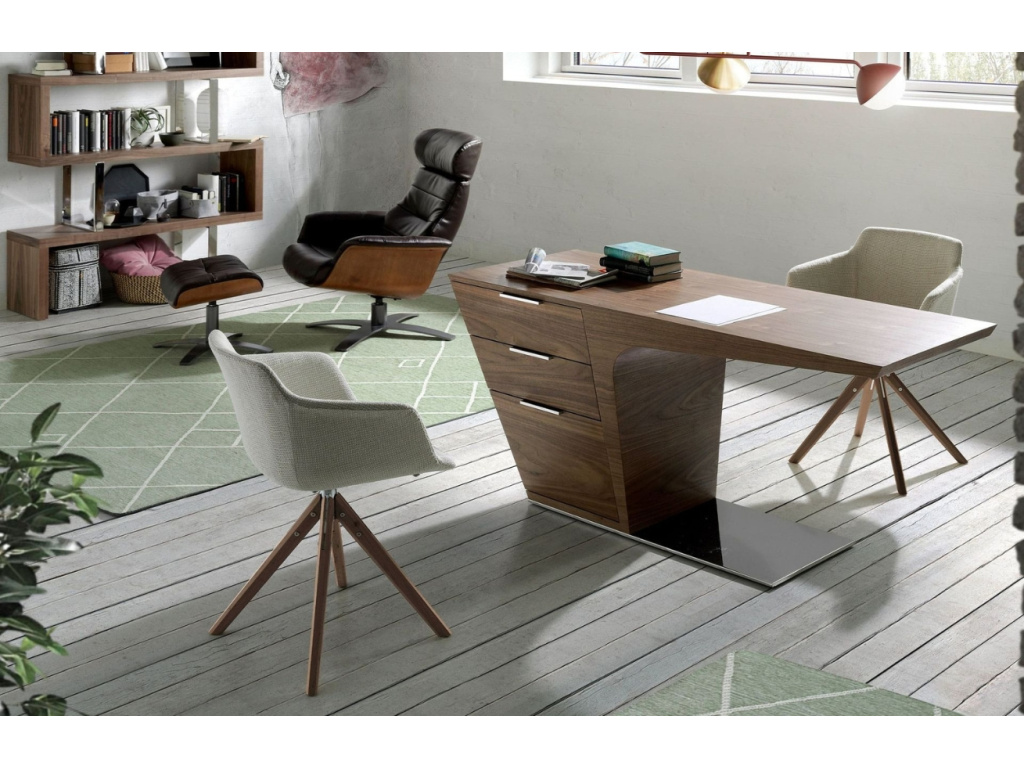 Tento výrazný pracovní stůl se stane dominantou vaší pracovny či kanceláře. Originálně tvarovaná konstrukce z přírodní ořechové dýhy je nejen vizuálně poutavá, ale také stabilní díky chromované nerezové podnoži. Pracovní plocha vám dopřeje velkorysý prostor pro zpracování vašich projektů. Tři praktické zásuvky s tichým dovíráním zajistí, že budete mít všechny důležité dokumenty vždy po ruce. Perfektní volba pro ty, kdo chtějí spojit funkčnost s výrazným designem.