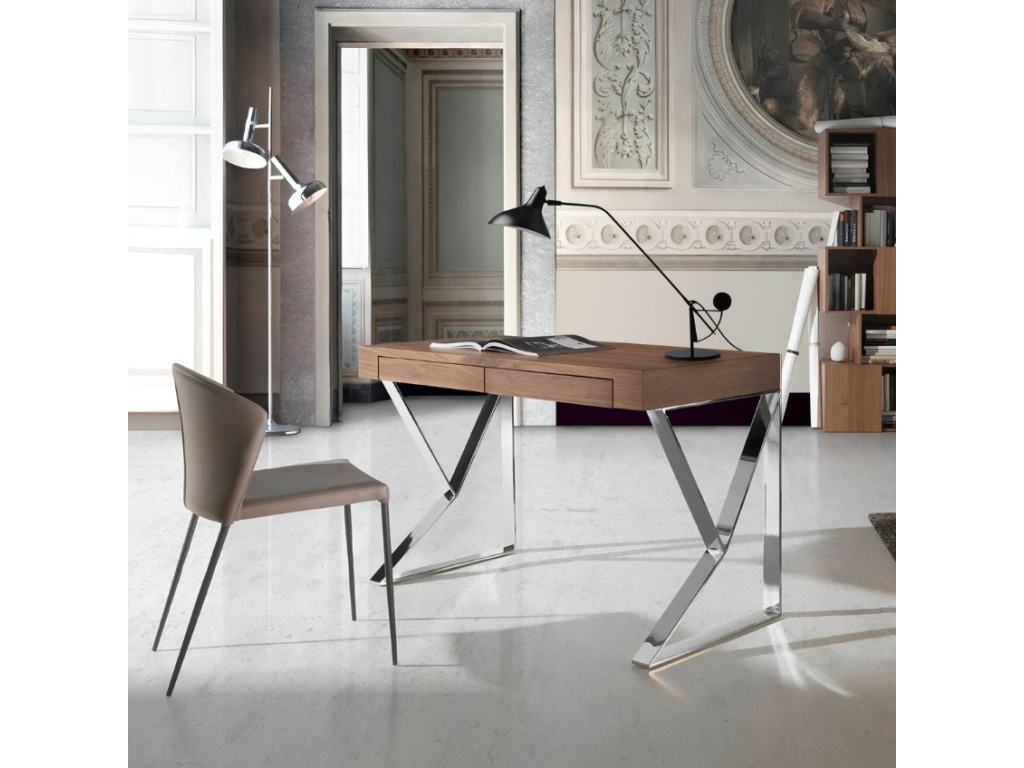 Tento pracovní stůl se stane dominantním prvkem vašeho interiéru díky nadčasové kombinaci přírodní ořechové dýhy a kovové podnože v chromované úpravě. Jeho precizně zpracovaná linie a geometrická podnož dodají prostoru dynamiku. Dvě prostorné zásuvky s funkcí push and pull udrží všechny vaše pracovní nezbytnosti po ruce. Ať už stůl využijete k práci, psaní či přípravě projektů, vždy s jeho pomocí vytvoříte inspirativní prostředí. Skvělá volba pro interiéry v duchu moderního minimalismu s prvky luxusu.