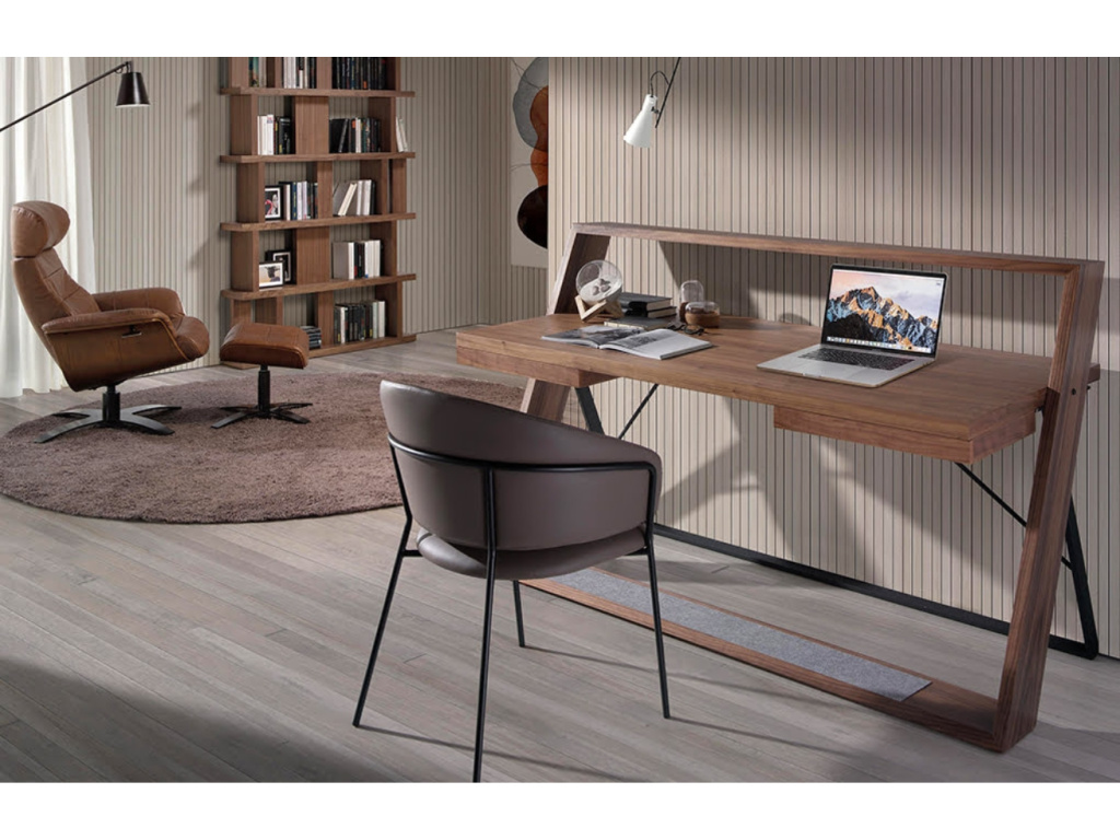 Hledáte-li designový pracovní stůl s vekou pracovní plochou může být tento od Angel Cerdá správnou volbou. Masivní prostorná deska z ořechové dýhy se dvěma zásuvkami je doplněna o dřevěný rám, který na jedné straně tvoří podnož stolu, na druhé praktickou odkládací polici. Pro zaručení perfektní stability je podnož doplněna o ocelovou konstrukci, která v kombinaci se dřevem dodává stylový kontrast. Stůl se bude skvěle hodit do rustikálních moderních interiérů.