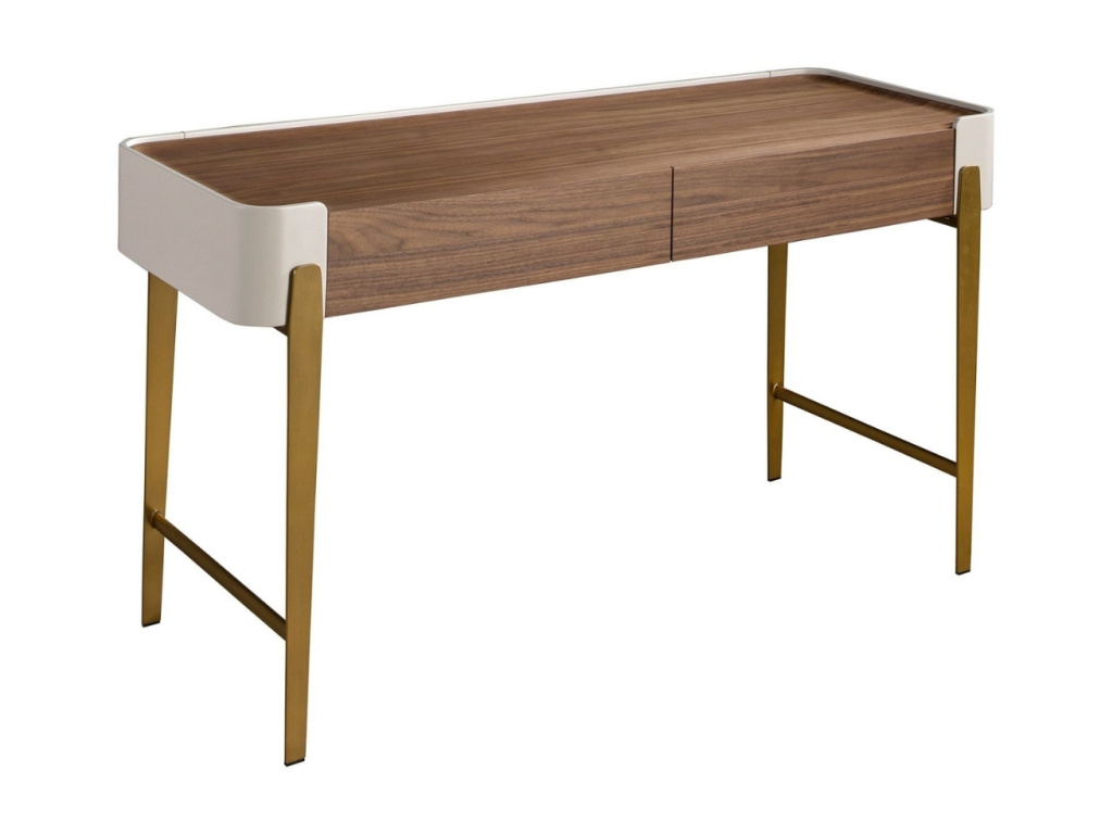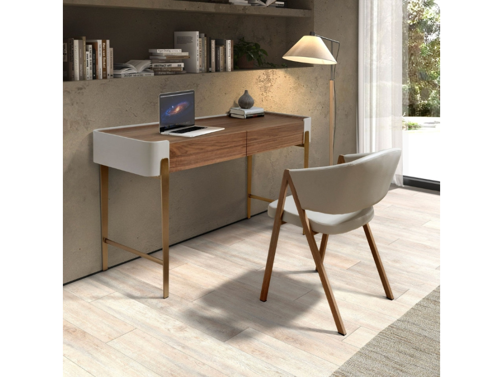 Pracovní stůl Angel Cerdá spojuje praktičnost s moderním designem – přírodní ořechová dýha, béžově lakované prvky a zlatá podnož z leštěné nerezové oceli tvoří harmonický a sofistikovaný celek. Díky dvěma prostorným zásuvkám s tichým zavíráním budete mít všechny pracovní nezbytnosti vždy přehledně po ruce. Tento psací stůl vyniká nejen svým elegantním vzhledem, ale i vysokou funkčností, která udrží vaši domácí kancelář či pracovnu stylově uspořádanou. Béžový lak dodává celku jemnou noblesu, díky níž se stane ozdobou každého moderního interiéru. Tento stůl je ideální volba pro ty, kdo chtějí pracovat v inspirativním a esteticky promyšleném prostoru.