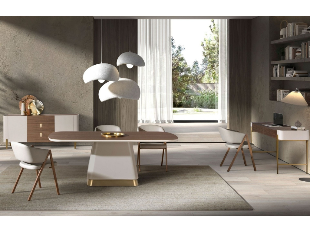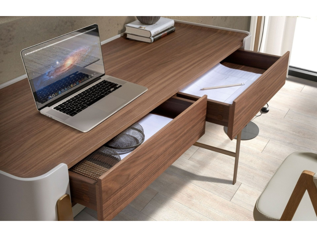 Pracovní stůl Angel Cerdá spojuje praktičnost s moderním designem – přírodní ořechová dýha, béžově lakované prvky a zlatá podnož z leštěné nerezové oceli tvoří harmonický a sofistikovaný celek. Díky dvěma prostorným zásuvkám s tichým zavíráním budete mít všechny pracovní nezbytnosti vždy přehledně po ruce. Tento psací stůl vyniká nejen svým elegantním vzhledem, ale i vysokou funkčností, která udrží vaši domácí kancelář či pracovnu stylově uspořádanou. Béžový lak dodává celku jemnou noblesu, díky níž se stane ozdobou každého moderního interiéru. Tento stůl je ideální volba pro ty, kdo chtějí pracovat v inspirativním a esteticky promyšleném prostoru.