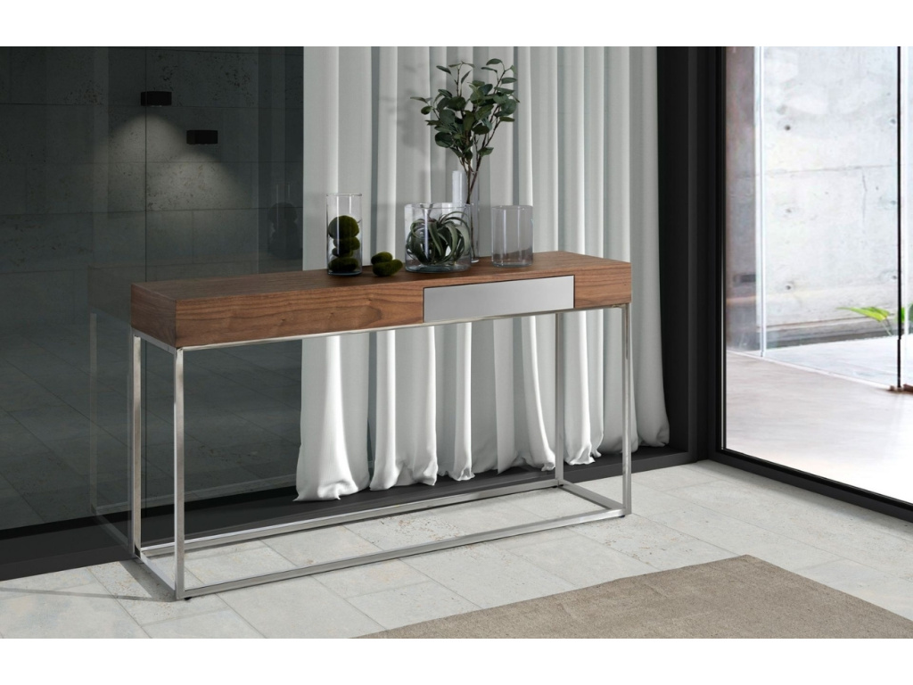 Jednoduchost a elegance v dokonalé harmonii. Tento moderní toaletní stolek z přírodní ořechové dýhy přinese do interiéru příjemnou hřejivost, zatímco chromovaná nerezová podnož mu dodává vzdušný a odlehčený vzhled. Jemný kovový detail na zásuvce podtrhuje promyšlený design a zároveň nabízí praktický úložný prostor pro vaše drobnosti. Decentní, ale nepřehlédnutelný kousek, který skvěle doplní váš moderní prostor.