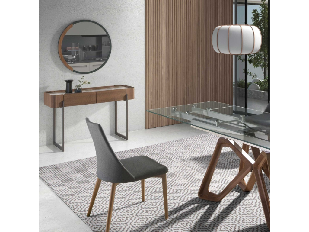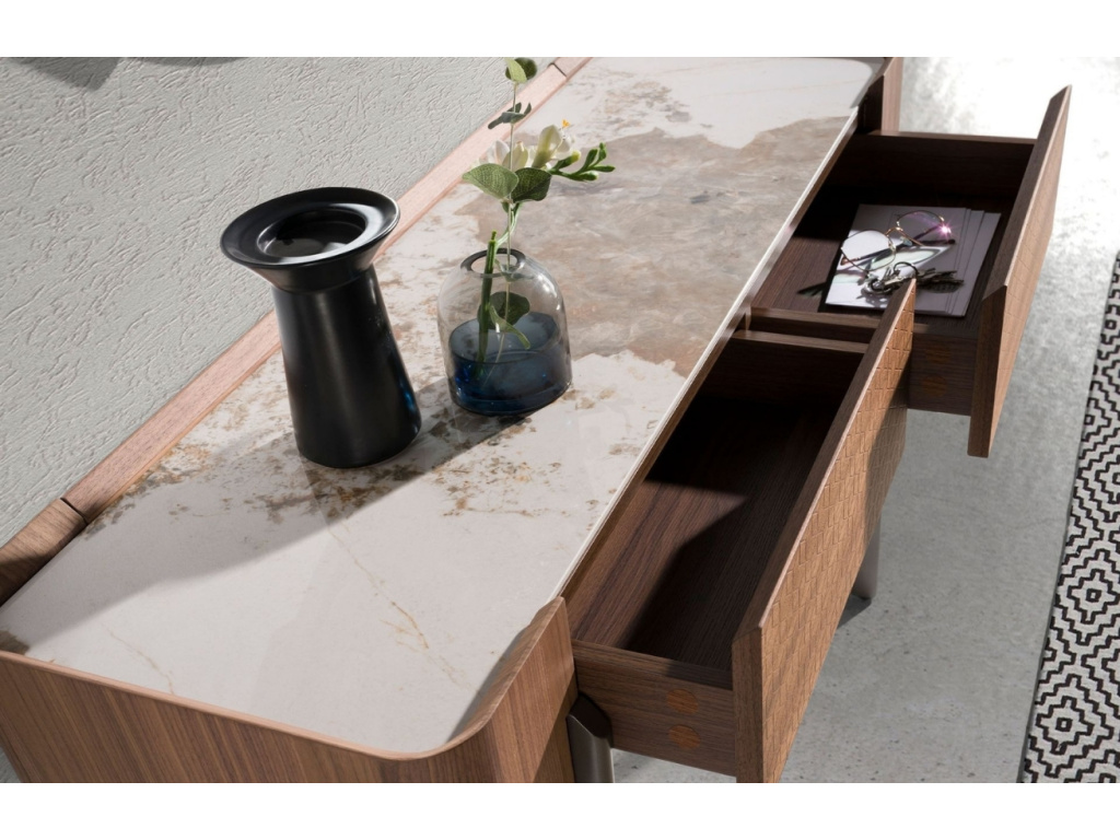 Toaletní stolek Angel Cerdá v sobě snoubí moderní estetiku s praktickým využitím – jeho deska z bílého porcelánového mramoru se zemitým žilkováním dodá vašemu interiéru svěžest a šmrnc. Díky dvěma šikovným zásuvkám si v něm snadno uschováte kosmetiku, šperky i další nezbytnosti. Ořechová dýha spolu s tmavou kovovou podnoží vytvoří harmonický kontrast, který oživí váš předsíňový kout či ložnici. Tento kousek se bude skvěle vyjímat v interiéru inspirovaném moderní elegancí a přírodními materiály.