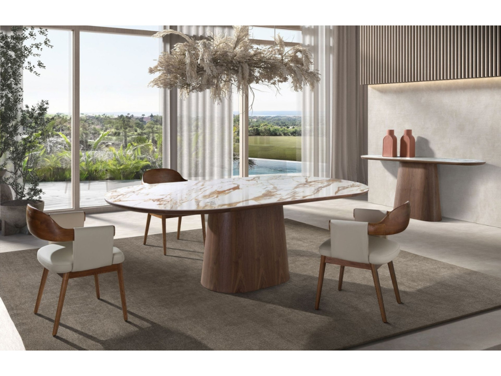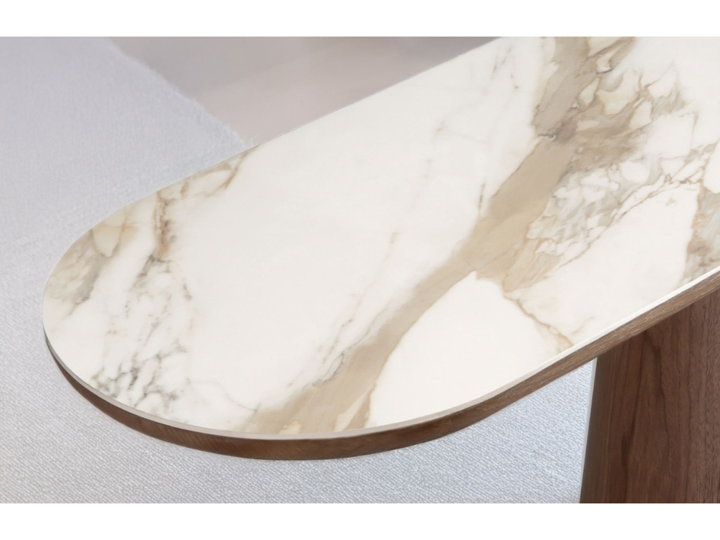 Objevte krásu kontrastů s toaletním stolkem Angel Cerdá – oválným kouskem, který v sobě spojuje přirozené teplo ořechové dýhy a luxusní vzhled porcelánové desky v mramorovém dekoru. Jeho harmonická silueta a nadčasové materiály z něj dělají nejen praktický doplněk, ale i výrazný designový solitér. Porcelánová horní deska je odolná vůči poškrábání i vysokým teplotám, a díky tomu je nejen krásná, ale i funkční. Podnož s ořechovou povrchovou úpravou působí subtilně, přesto poskytuje stabilní základ. Tento stolek se stane elegantním detailem, který dotvoří váš interiér s lehkostí a charakterem. Sladit ho navíc můžete také s odkládacím, konferenčním a jídelním stolem!