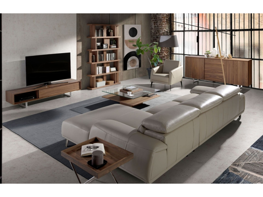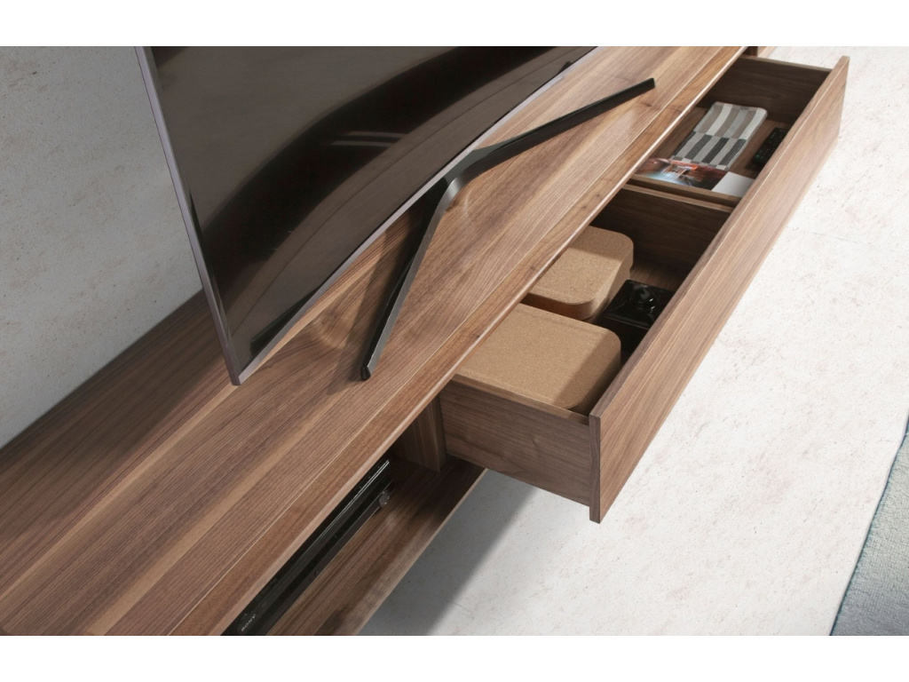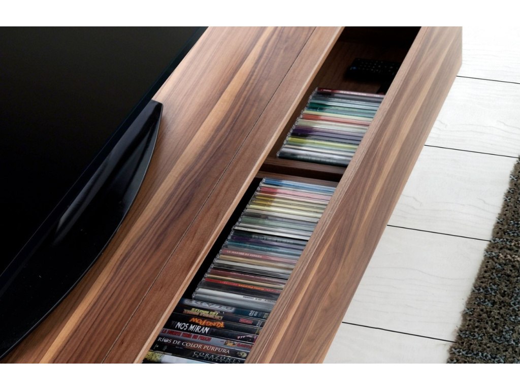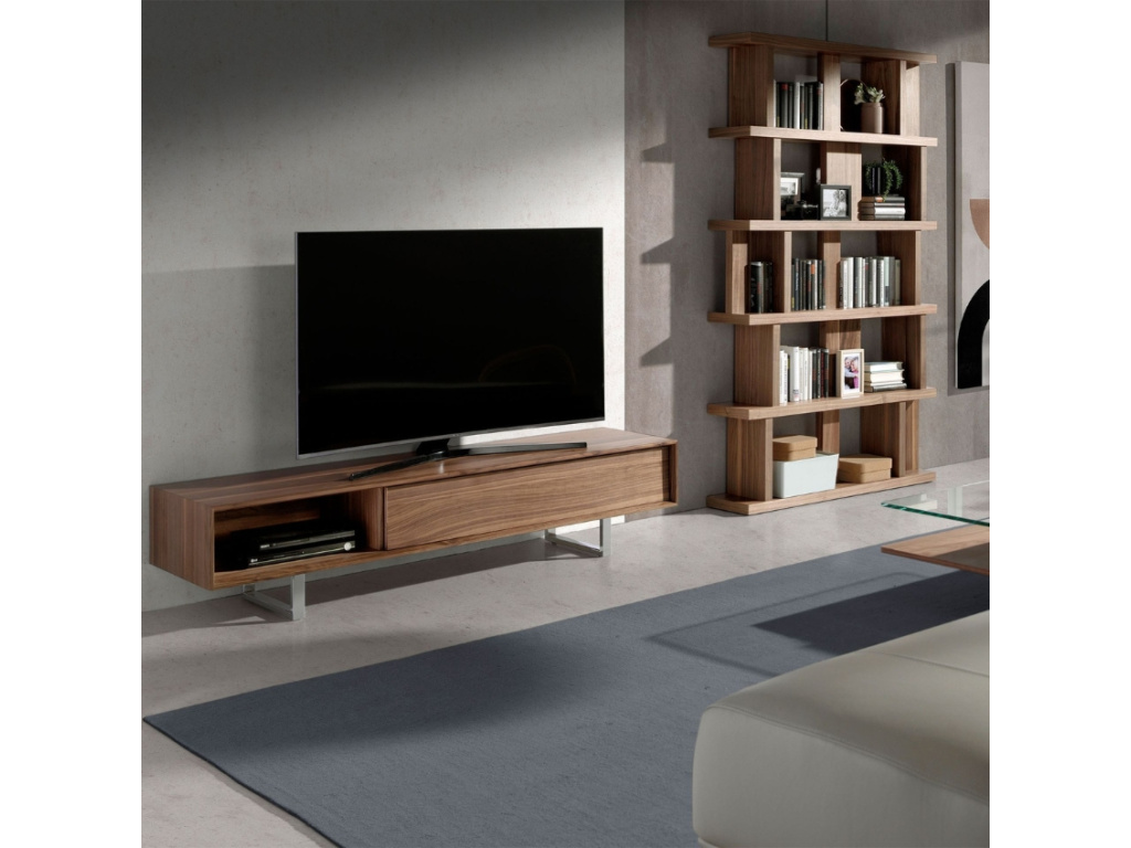 Tento minimalistický TV stolek z ořechové dýhy spojuje funkčnost a eleganci. Lehká kovová podnož s chromovaným povrchem mu dodává vzdušný charakter. Prostorná zásuvka se systémem push-to-open pojme veškeré multimediální příslušenství a umožní snadný přístup bez rušivých úchytů. Přírodní kresba dřeva přinese do vašeho obývacího pokoje příjemnou atmosféru a teplo domova. Stolek se skvěle hodí do moderních i industriálních interiérů s důrazem na čisté linie.