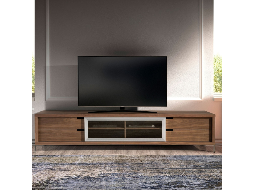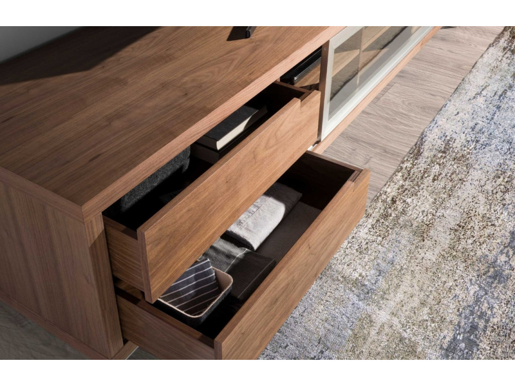 Luxusní TV stolek s precizním provedením spojuje přírodní dřevo, sklo a ocel do dokonale vyváženého kusu nábytku. Čtyři prostorné zásuvky a posuvná skleněná dvířka umožňují snadné uspořádání elektroniky i dalších nezbytností. Chromovaná podnož dodává stolku lehkost a opticky zvětší prostor. Tento nadčasový kousek perfektně zapadne do interiérů se smyslem pro moderní estetiku a funkčnost.