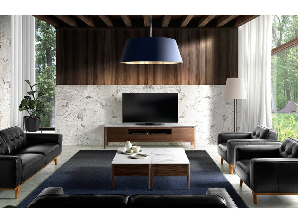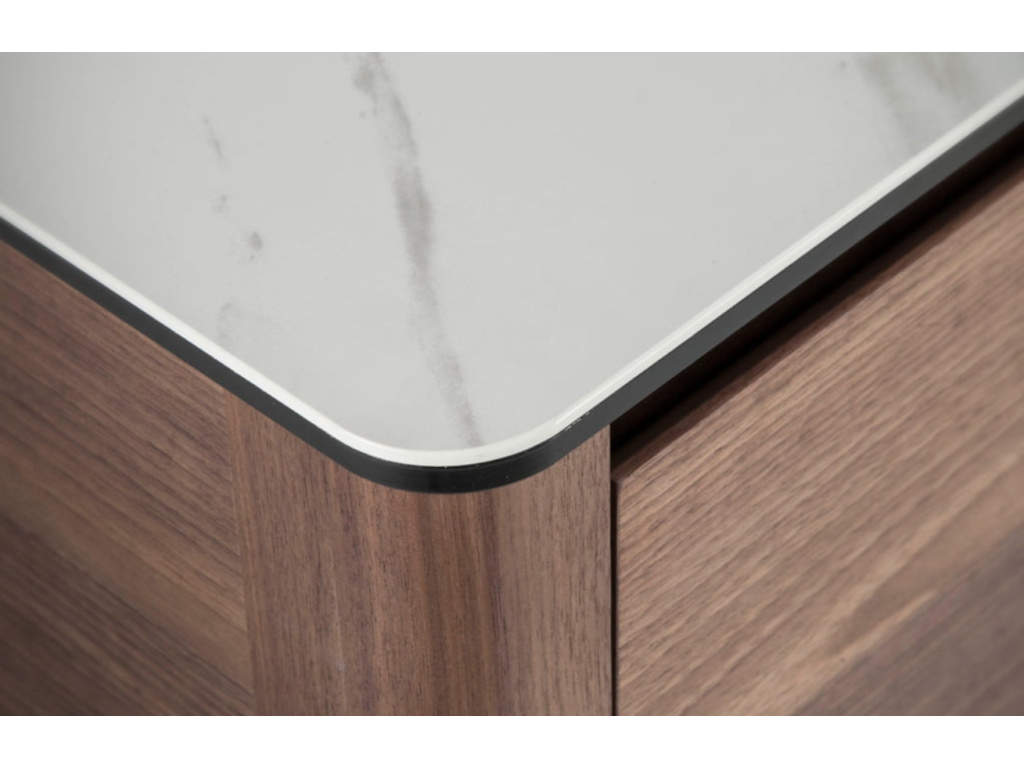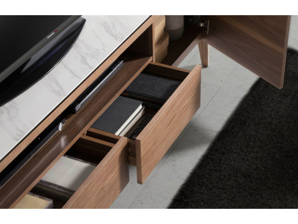 Televizní stolek značky Angel Cerdá udrží vše na svém místě díky velkorysému úložnému prostoru v podobě otevřené police, dvěma centrálním zásuvkám se systémem otevírání "push to open" a dvěma uzavřeným policiím se systémem tichého zavírání. Ořechovou dýhu korpusu doplňuje luxusní porcelánová vrchní deska s dekorem mramoru. Tento stolek je skvělou volbou pro ty, kteří si potrpí na moderní design a nestárnoucí klasiku.