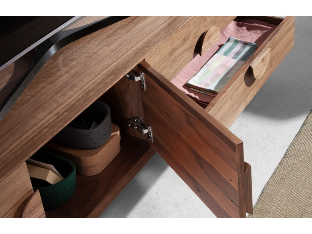 Robustní korpus televizního stolku Angel Cerdá z ořechové dýhy příjemně kontrastuje se subtilní černou podnoží z nerezové oceli. Každého jistě potěší jeho úložný prostor v podobě dvou zásuvek a dvou polic s dvířky. Zajímavým detailem jsou výrazné masivní úchytky, které dominují celému korpusu nábytku. Díky ořechovému dřevu se stolek bude dobře vyjímat v hřejivém prostoru rustikálních interiérů nebo všude tam, kde převládají přírodní materiály.