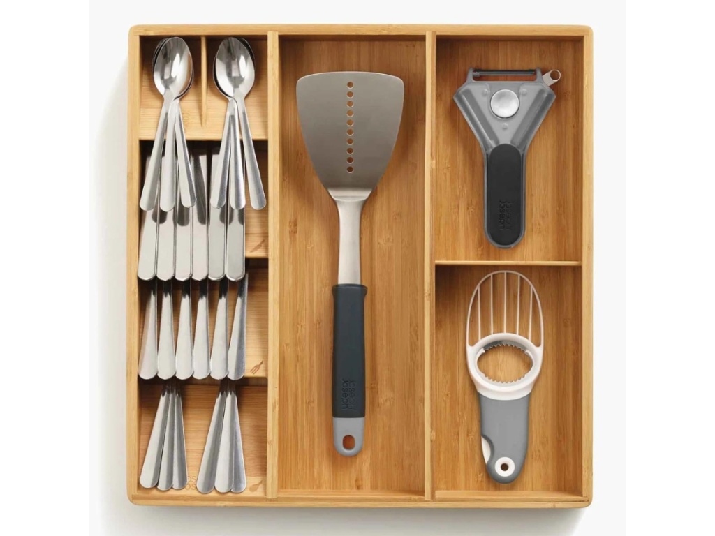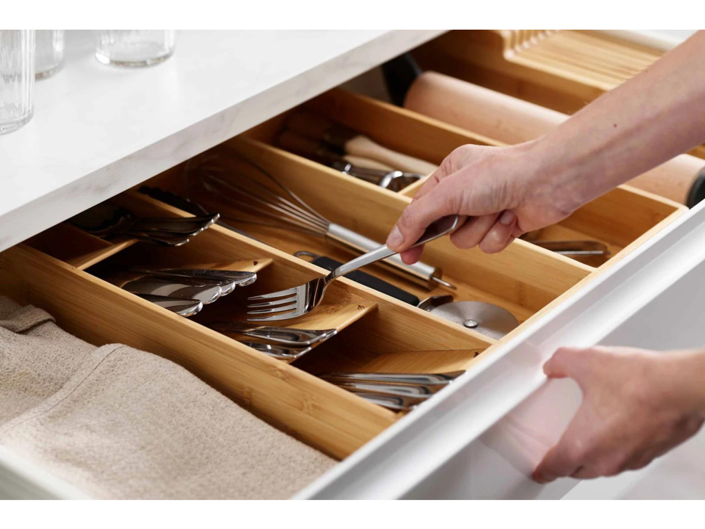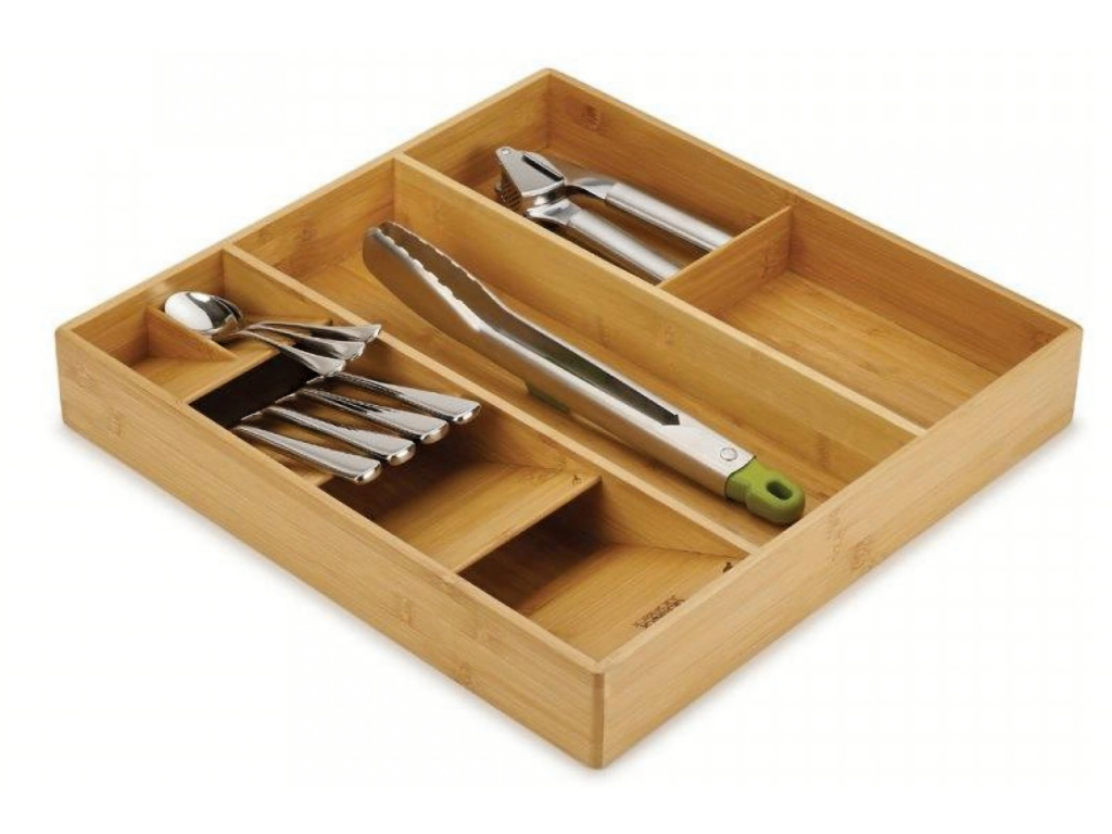 Pořiďte si praktického a elegantního pomocníka k uspořádání vašich příborů! Díky organizéru DrawerStore Compact Bamboo od Joseph Joseph ušetříte více než polovinu místa v zásuvce – příbory se ukládají pod úhlem nad sebou. Příbory můžete vkládat do označených slotů oboustranně. Další přihrádky jsou určeny k uskladnění velkých i malých kuchyňských nástrojů. Organizér lze použít v zásuvce s minimální hloubkou 8 cm.