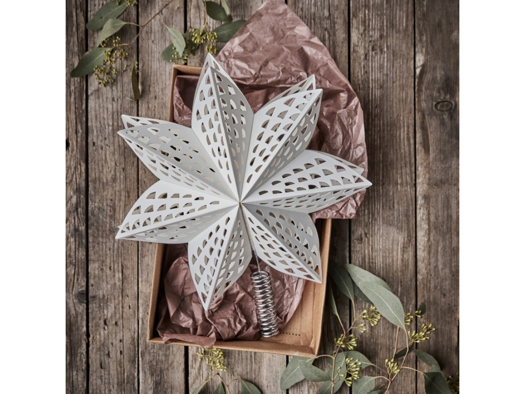 Bílá papírová hvězda Gint s jemnými výřezy vnese na váš vánoční stromek eleganci a půvab. Její precizní provedení zajišťuje, že bude nádherně vynikat ze všech úhlů, a stane se tak ústředním prvkem vaší výzdoby. Kovová spirála na spodní části umožňuje snadné a bezpečné upevnění na špičku stromku. Hvězda je ideální volbou pro milovníky minimalistických a sofistikovaných dekorací.