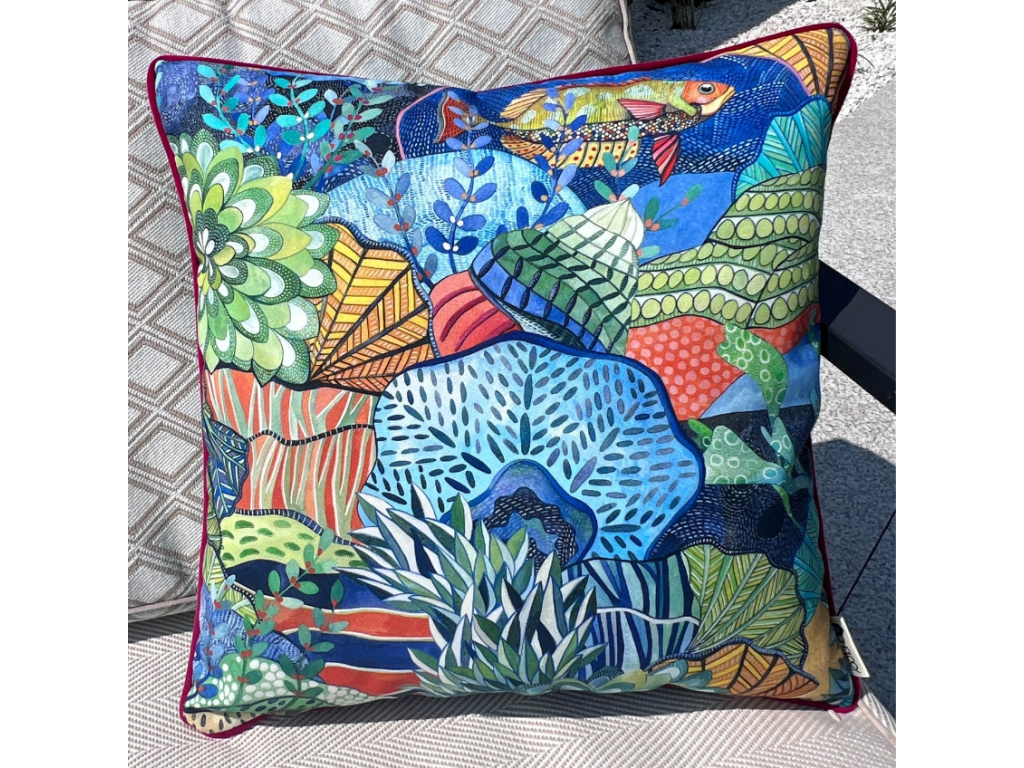 Povlak na polštář Marine od české značky BOHOLOGY zaujme na první pohled originálním motivem podmořského světa. Je ušitý z kvalitních anglických látek Osborne&Little, které se vyznačují výraznými barvami a nádhernými vzory, které vznikají pod rukama světových návrhářů. Tyto látky jsou vhodné do interiéru i exteriéru, kde snesou i náhlý letní déšť. Druhá strana povlaku je jednobarevná, takže pokud zatoužíte po změně, můžete polštář kdykoliv otočit a vzor tak na chvíli skrýt. Po straně se ukrývá zip, díky čemuž lze povlak jednoduše sundat a vyprat. Marine se rychle stane vaším oblíbeným společníkem při venkovním posezení, které si můžete libovolně nakombinovat spolu s dalšími povlaky z této řady.