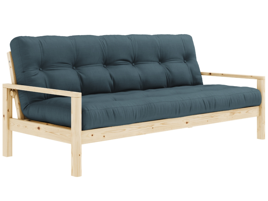 Pohovka nebo postel? Trojmístná rozkládací pohovka Knob od dánské značky Karup Design umí být obojím! Pod dřevěnými područkami se nachází dva nenápadné úchyty, které lze snadno odšroubovat a vy tak během chvilky získáte pohodlné lůžko pro vás nebo vaše hosty. Konstrukce z masivního borovicového dřeva s FSC certifikací je doplněna kvalitní 14cm futonovou matraci, která v sobě kombinuje recyklovaná vlákna a 4 cm pěny. Pohovka Knob fantasticky zapadne do skandinávských a japonských stylů interiérů, do kterých vnese jednoduchost, eleganci a ryzí funkčnost. Představuje skvělé řešení zejména pro menší prostory, do kterých přinese další místo na spaní. Vybrat si ji můžete v další barvě konstrukce či v mnoha barvách matrací.