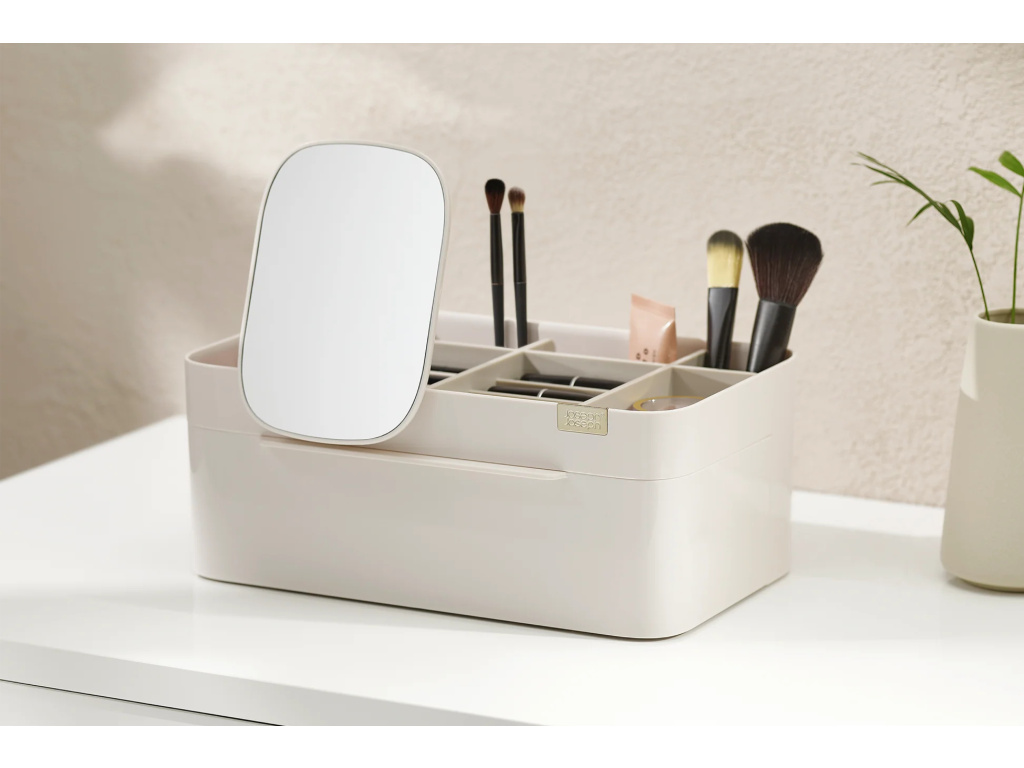 Dopřejte si pohodlí při každodenním líčení s tímto malým šikovným pomocníkem! Organizér na kosmetiku a doplňky Viva od značky Joseph Joseph disponuje hlubokými přihrádkami na štětce, řasenky, tužky na oči a oční linky. Mělké přihrádky jsou vhodné například na balzámy na rty, pudřenky či oční stíny. Velká zásuvka s magnetickým uzávěrem lze využít na vatové tampony, vatové tyčinky a houbičky na odlíčení. Odnímatelné zrcátko s trojnásobným zvětšením na zadní straně lze uložit do štěrbiny v zadní části organizéru nebo jednoduše nasadit na přední okraj.
