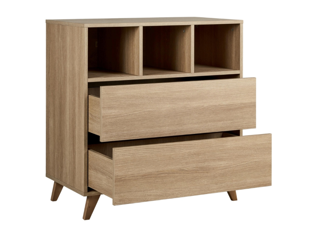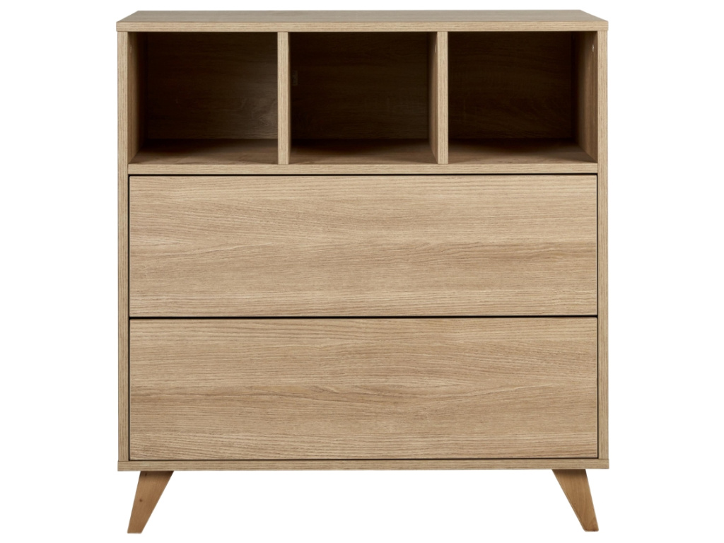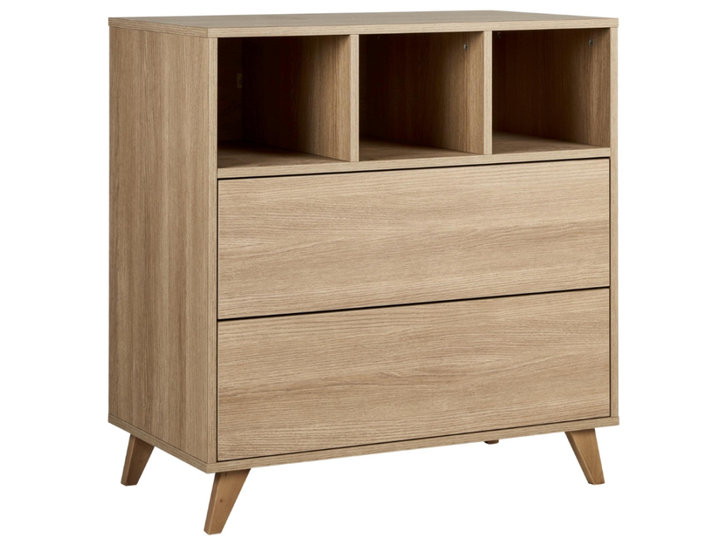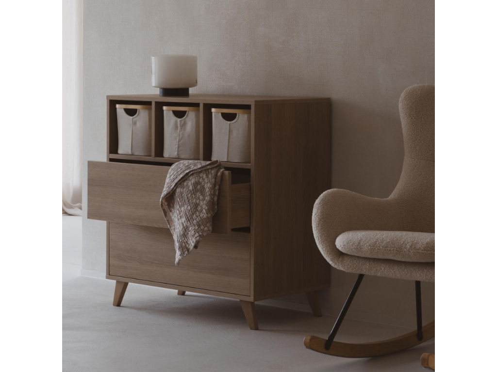 Značka Quax přichází s řadou Loft, která vás zaujme nejen svým minimalistickým designem, ale také praktičností a funkčností. Korpus této komody je kompletně vyrobený z laminátu v dřevěném dekoru, který v kombinaci s masivní bukovou podnoží vytváří elegantní design. Komoda disponuje 3 otevřenými přihrádkami pro snadnější přístup k věcem, které potřebujete mít při přebalování po ruce. Dále disponuje 2 prostornými zásuvkami, které bohatě postačí pro uložení oblečení pro vaše miminko. Komodu lze využít samostatně nebo při dokoupení nástavby se z ní rázem stane přebalovací pult. Doporučujeme kombinaci více prvků z řady Loft pro dokonale ucelený interiér.