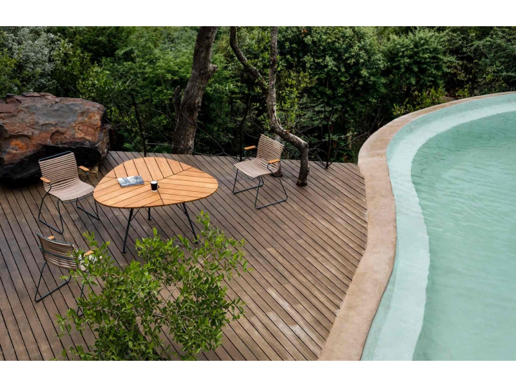 HOUE Leaf je krásný zahradní jídelní stůl, který jak už název napovídá tvarem připomíná list. Stůl HOUE Leaf je designový unikát, který vás zaujme svým osobitým vzhledem. Přírodní deska z bambusových lamel a lakovaná kovová podnož vytváří atraktivní spojení, které ozvláštní vaši zahradu, terasu či interiér.