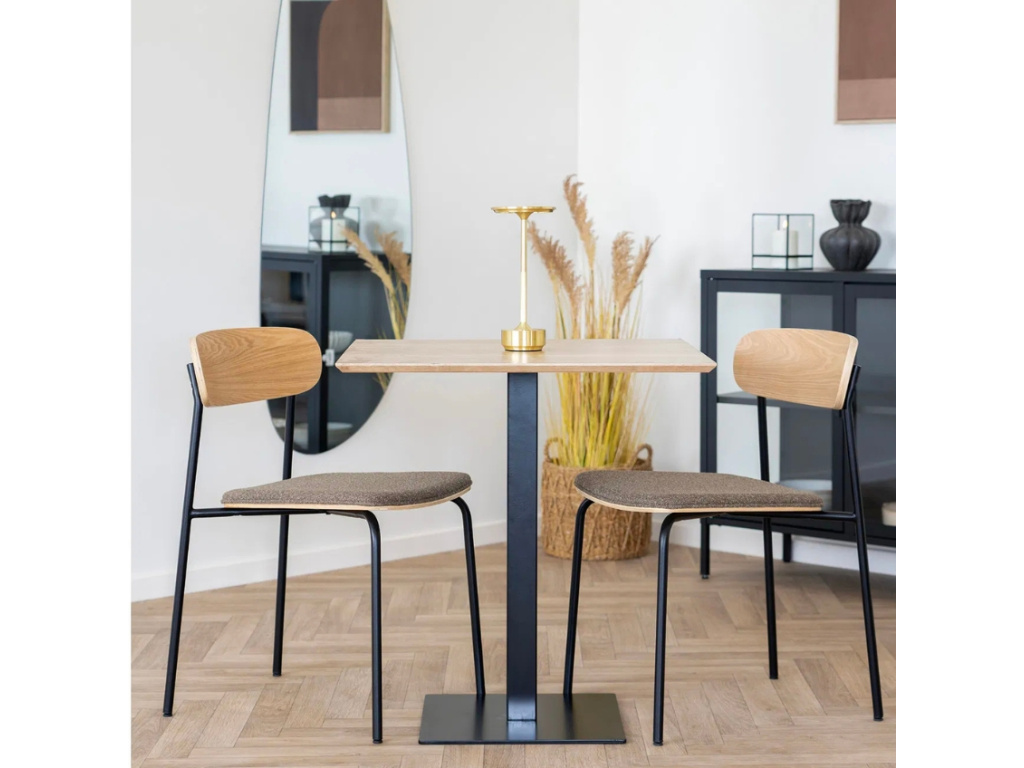 Bistro stolek Fare bude přesně to, co doma potřebujete pro rychlou snídani nebo klidnou chvilku s kávou. Jeho čtvercová deska z MDF potažené melaninem imitující přírodní dřevo vypadá lehce, zatímco černá kovová podnož dodá celku stabilitu i styl. Skvěle zapadne do městského bytu nebo domácí kavárenské zóny. A když se na něj položí váza s květinou, hrnek nebo croissant, působí skoro jako z instagramového záběru. Snadno se udržuje a nezabere zbytečně moc místa – ideální kousek pro malé kuchyně nebo jídelní kouty.