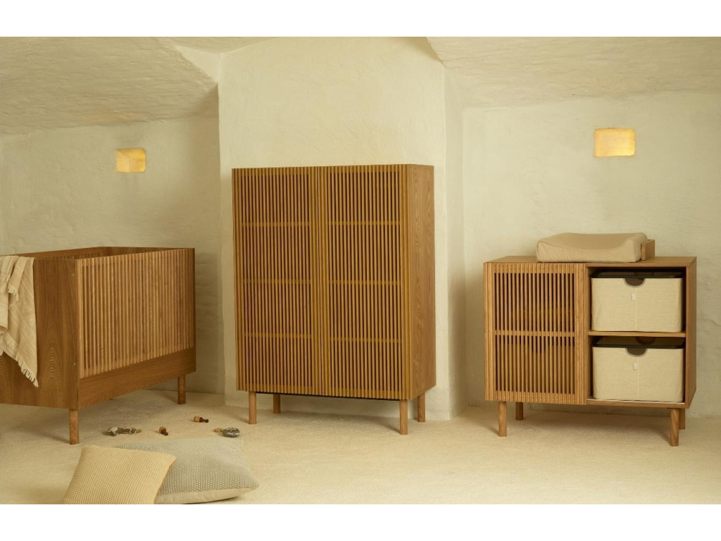 Designová postýlka Quax Hai-No-Ki je inspirována japonskými vzdušnými interiéry. Elegantní dýhovaná MDF s kresbou jasanového dřeva, ze kterého je vyrobena i podnož vnese nádech přírody do minimalistických i skandinávských interiérů. Postýlku je možné nastavit podle potřeby maminky i dítěte. Když děti vyrostou, je možné odmontovat jednu stranu postýlky a tím vytvořit místečko, kam se děti mohou bez pomoci schovat a usnout.