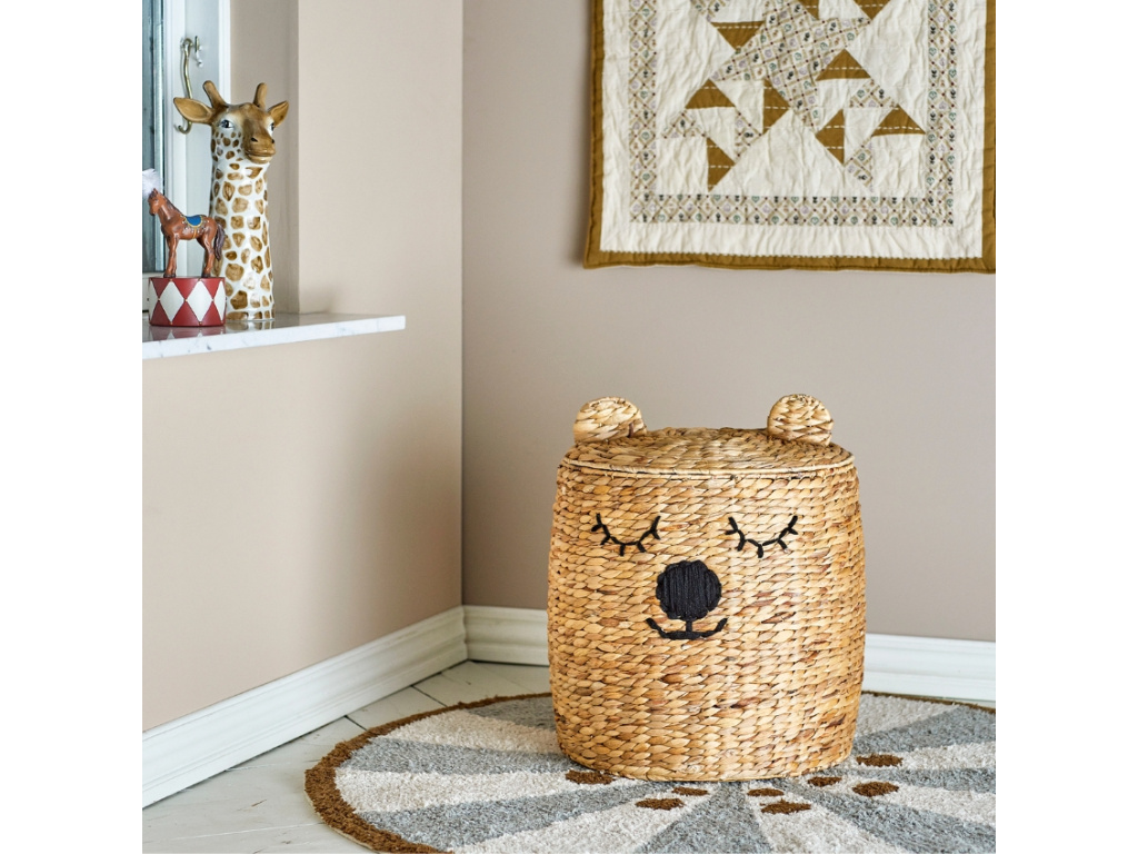 Originální úložný box Bloomingville Dolma nabízí dostatek prostoru na hračky, knihy nebo oblečení. Disponuje odnímatelným víkem s malými oušky a jeho přední stranu zdobí roztomilý obličej spícího medvídka. Box je upleten z listů vodního hyacintu a skvěle tak zapadne do přírodně laděných interiérů.