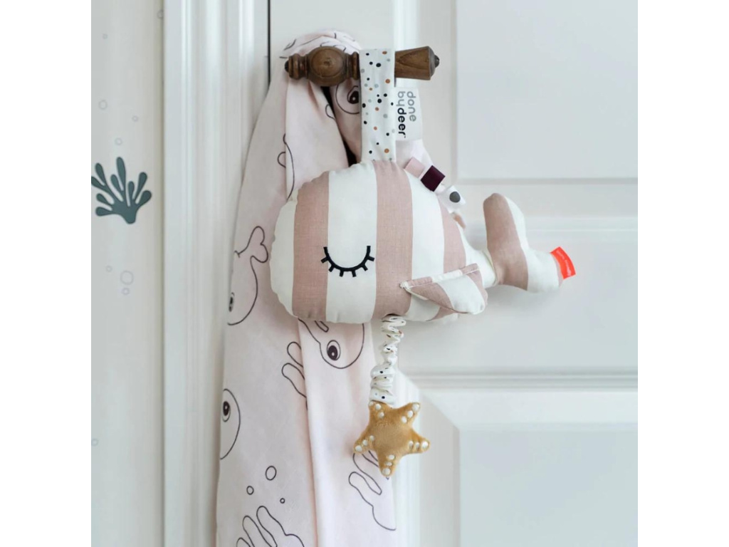 Krásná ospalá velryba Wally s jemnými růžovými pruhy má roztomilé detaily, jako jsou kontrastní tečky a měkká plyšová hvězdička. Uklidní vaše děťátko, když je čas si odpočinout nebo vyrazit do říše snů. Praktické poutko slouží k připevnění Wallyho na dětskou postýlku, autosedačku i na hrazdičku.