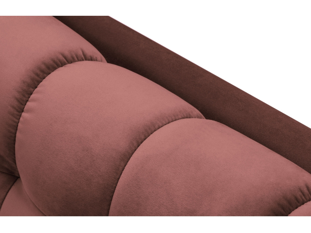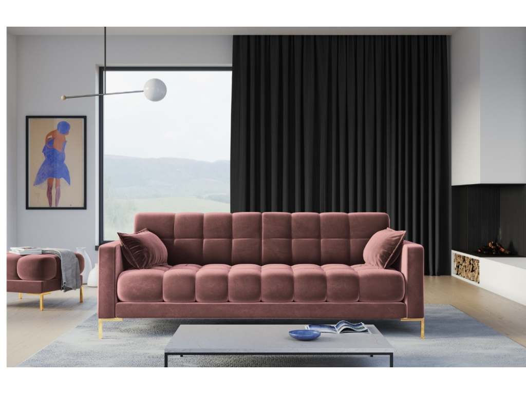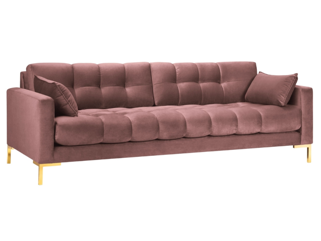 Elegantní čtyřmístná pohovka MICADONI MAMAIA zaujme na první pohled svým nadýchaným vzhledem. Velmi příjemné sametové čalounění a zlatá kovová podnož vytváří kontrast, který interiéru dodá elegantní vzhled a nádech luxusu. Díky zajímavému prošívání vzniká jemný design, který do vašeho domova vnese lehkost a styl. Opěrné polštářky zvednou úroveň vašeho odpočinku o stupeň výš. Nechte se obklopit komfortem ve společnosti pohovky Mamaia.