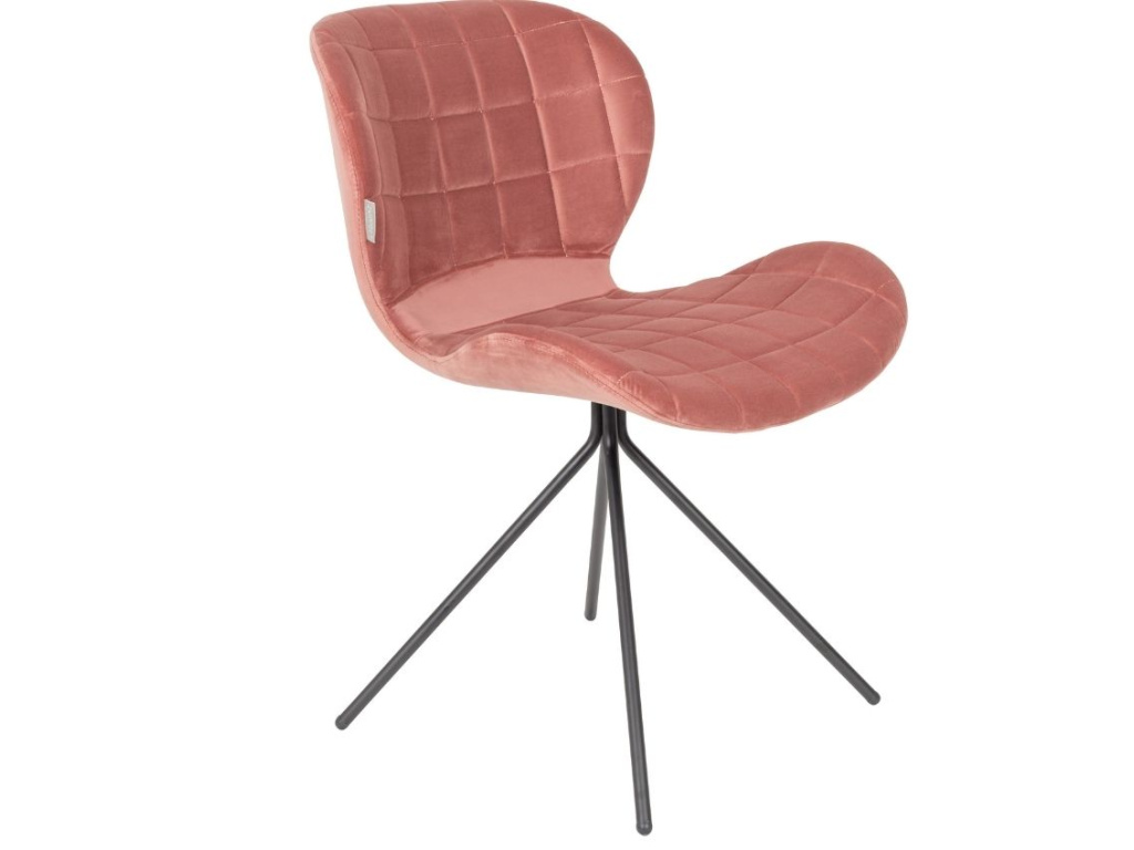 Elegantní designová čalouněná jídelní židle ZUIVER OMG. Základnu sedáku z kvalitní sametové látky v růžové barvě tvoří překližka pokryta tenkou vrstvou pěny, díky které si budete moci vychutnat úžasné pohodlí, a to beze strachu pádu, které Vám zaručí pevná ocelová podnož v elegantním černém provedení.