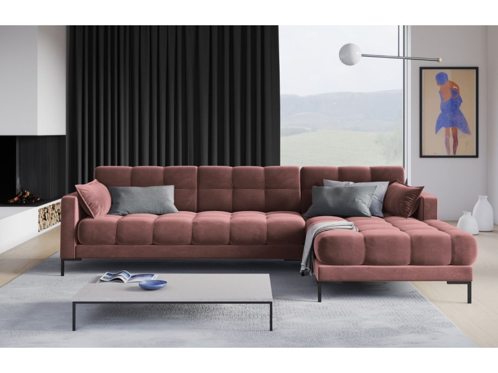 Elegantní rohová pohovka MICADONI MAMAIA zaujme na první pohled svým nadýchaným vzhledem. Velmi příjemné sametové čalounění a kovová podnož vytváří kontrast, který interiéru dodá elegantní vzhled a nádech luxusu. Díky zajímavému prošívání vzniká jemný design, který do vašeho domova vnese lehkost a styl. Opěrné polštářky zvednou úroveň vašeho odpočinku o stupeň výš. Nechte se obklopit komfortem ve společnosti produktů Mamaia.
