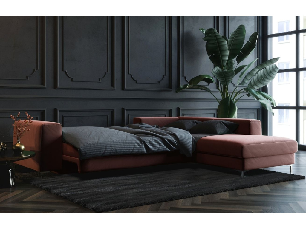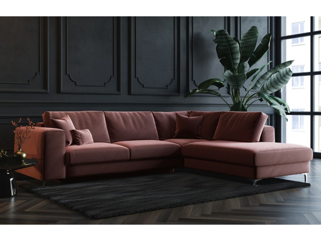 Moderní čtyřmístná pohovka DEVICHY Rothe s jednoduchou konstrukcí uspokojí potřeby i toho nejnáročnějšího zákazníka. Pohovku lze snadným rozložením přeměnit na pohodlné a dostatečně velké lůžko. Její čalounění si na první dotyk zamilujete - je tvořeno kvalitní sametovou tkaninou v růžovém provedení, která je charakteristická svou nadprůměrnou odolností a speciální vodoodpudivou úpravou. Reprezentativní a exkluzivní vzhled pohovky v sobě dokonale kombinuje pohodlí a styl. Pohovka je dostupná v levém i pravém provedení.